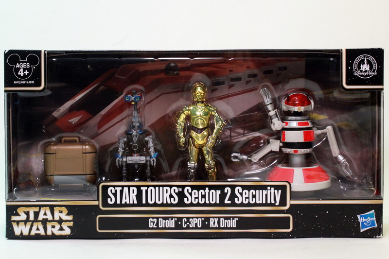 Star Tours: Sector 2 Security comes with a new G2 Droid, re-issue C-3PO, and a repainted RX Droid. There are two G2 Droids found in the queue, one scanning luggage and the other, voiced by Patrick Warburton, scanning passengers.