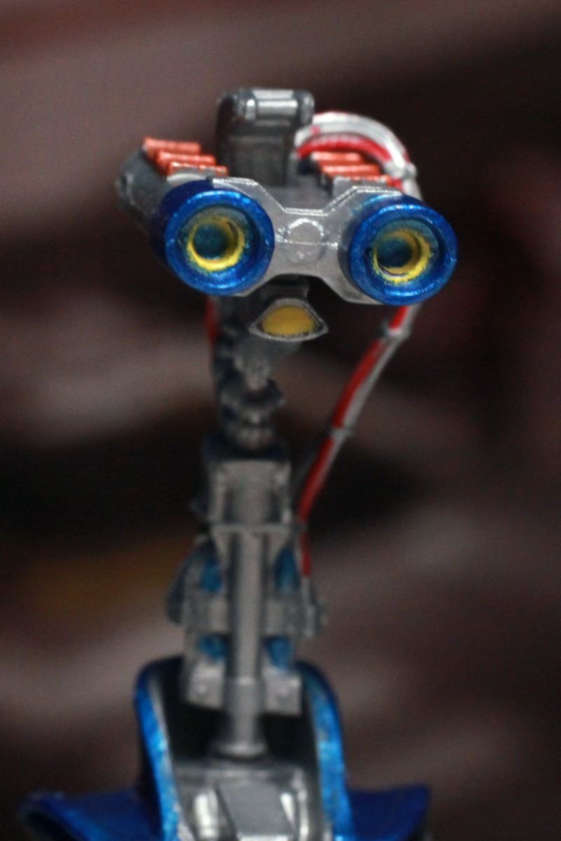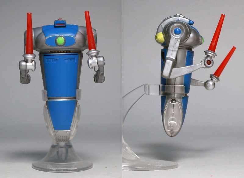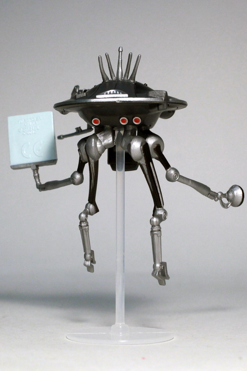 And the last figure in this set isn’t a bad guy at all, but part of the Star Tours company. As a Signal Droid, he helps guide the Starspeeder during take off and landing. You can find this particular blue Signal Droid when landing on Coruscant. The Signal Droid is identical to the previously released Signal Droid aside from the paint and has six points of articulation all in the arms. He also comes with a clear stand and a piece of luggage that CAN be opened! The Seeker Droid comes with a clear stand and six appendages that can be rotated if need be.