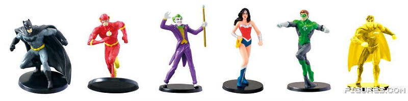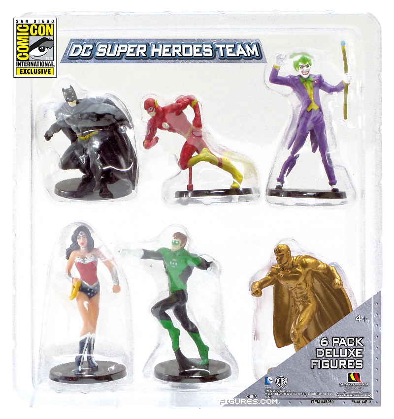 Measuring 2.75" tall, the heroes and villains in this set include: Batman, Flash, the Joker, Wonder Woman, The Green Lantern, and a figure found nowhere else, an Exclusive Gold Superman!