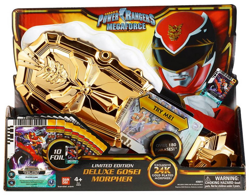 Harness the power of the Power Rangers Megaforce Gosei Morpher and unlock the secrets of the Power Cards! With only 300 produced, this Limited Edition Item is 24 Karat Gold Plated, includes 10 exclusive foil cards, and comes in collector full foil packaging.