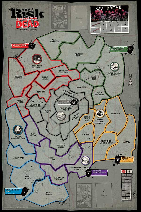 In RISK: The Walking Dead Survival Edition it’s a fun, new twist on classic Risk game play. USAopoly will debut a brand new map set in the Southeastern region of the United States where players battle and scavenge for their very lives within 32 territories. Fighting for survival at every turn, gamers must not only fend off attacks from the living that compete for precious, limited resources, but they also must maintain their self-preservation from the unrelenting hordes of the undead that would feast upon them. Zombies, also known as “Walkers” in The Walking Dead, will populate areas of the map and will continue to randomly spawn at the start of each players turn providing increased danger for the players. A new deck of "Supply Cards" will add strategy, fun and flavor to this classic tabletop game and “Event Cards” which reference story events from The Walking Dead provide players with challenges with potential rewards and penalties to create even more suspense filled interaction. The tokens, dice and cards represent essential The Walking Dead items that are used to strategically plan and execute plans of attack and build defense throughout the game. Gamers can expect a fast-paced game of attrition and survival, where this time—the last man standing wins!