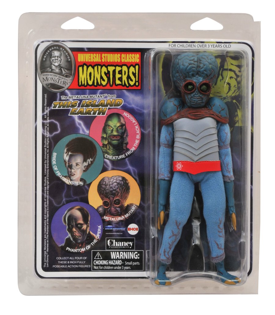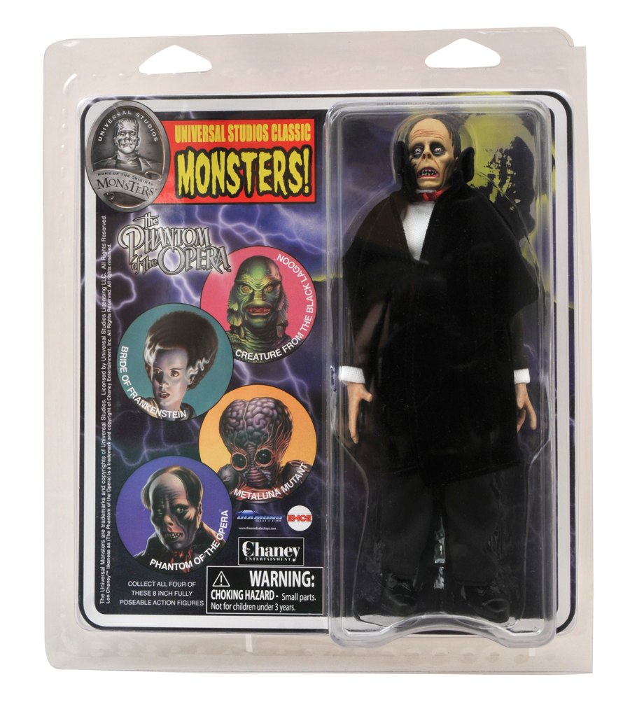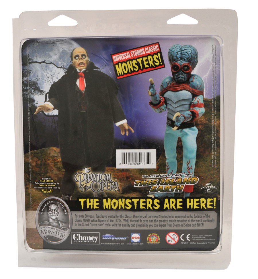 The fourth series of Universal Monsters Retro-Style Action Figures is due out in October, and DST already have packaged pics. The two new 8-inch, cloth-costume figures — inspired by the classic Mego figures of yesteryear — are of the Phantom of the Opera (as played by Lon Chaney) and the Metaluna Mutant from This Island Earth.
