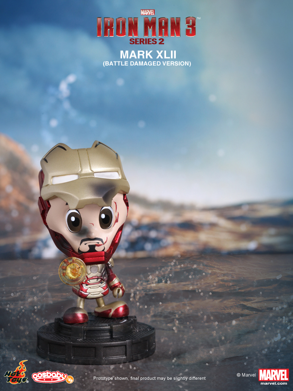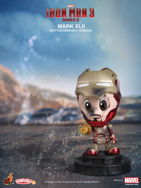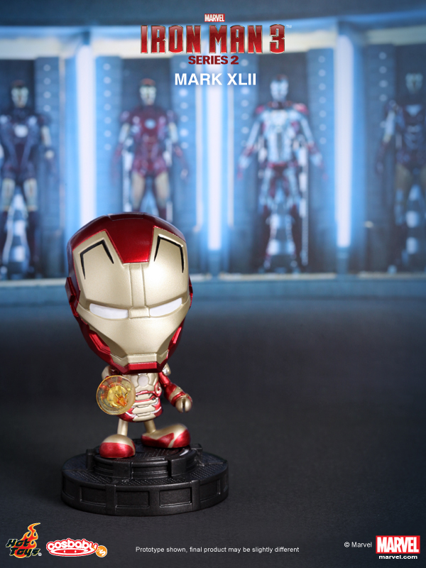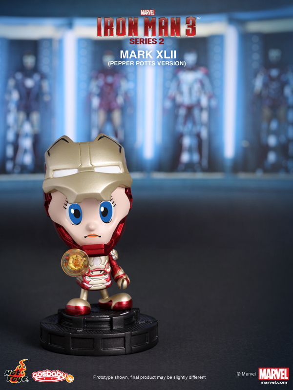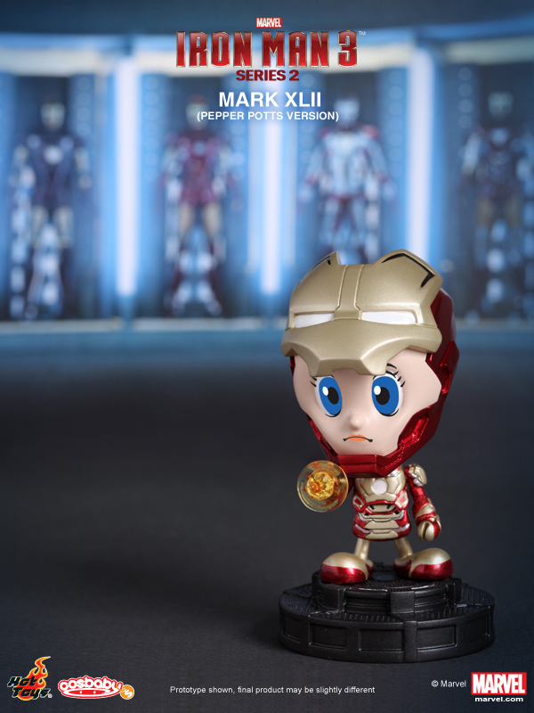 Hot Toys presents the Series 2 of their Iron Man 3 Cosbaby (S). This new series features Mark XLII, Mark XLII (Battle Damaged Version), Mark XLII (Pepper Potts Version), Tony Stark, Iron Patriot, and War Machine Mark II in baby form.