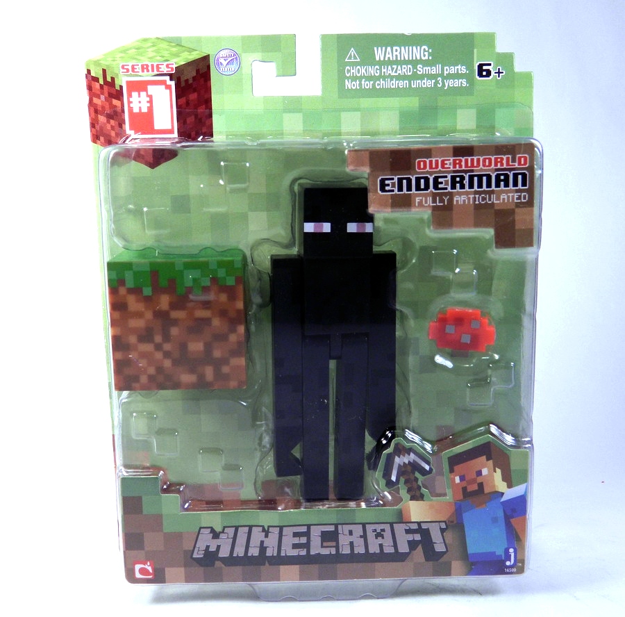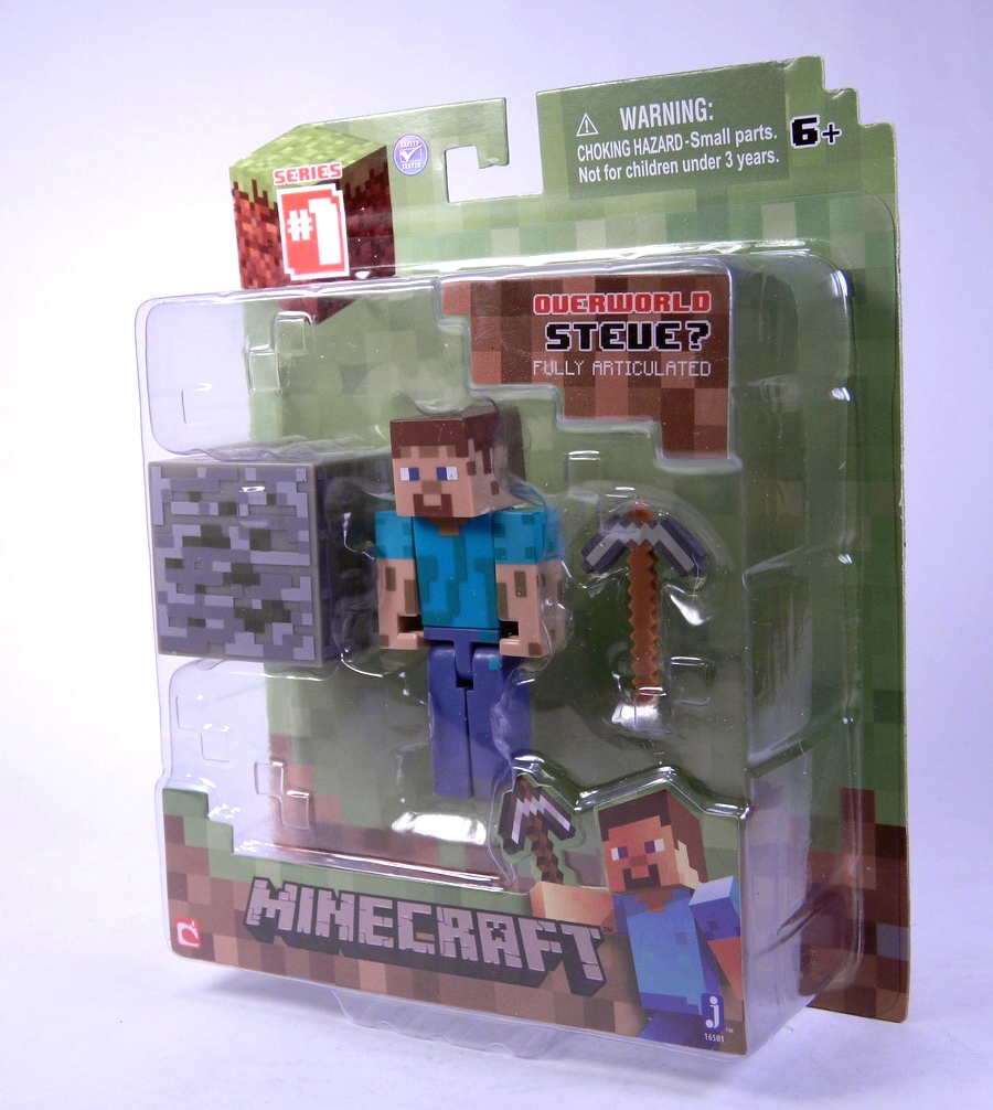 The action figures, sure to be the most popular Minecraft collectibles with fans, measure approximately 3 inches tall (4" for the tall and slender Endermen). These retail for $9.99 at mass market stores like Target and up to $11.99 at TRU. Like their blocky counterparts in the game, each figure sports limited articulation, but what makes these great (aside from their endearing pixilated sculpt) is that each figure packs a good amount of accessories. Series One stars: