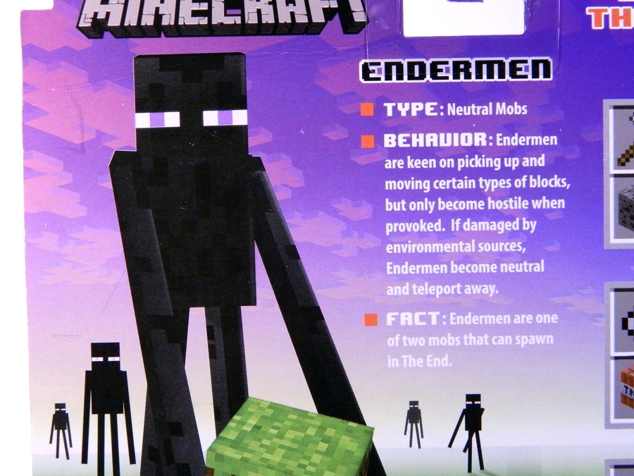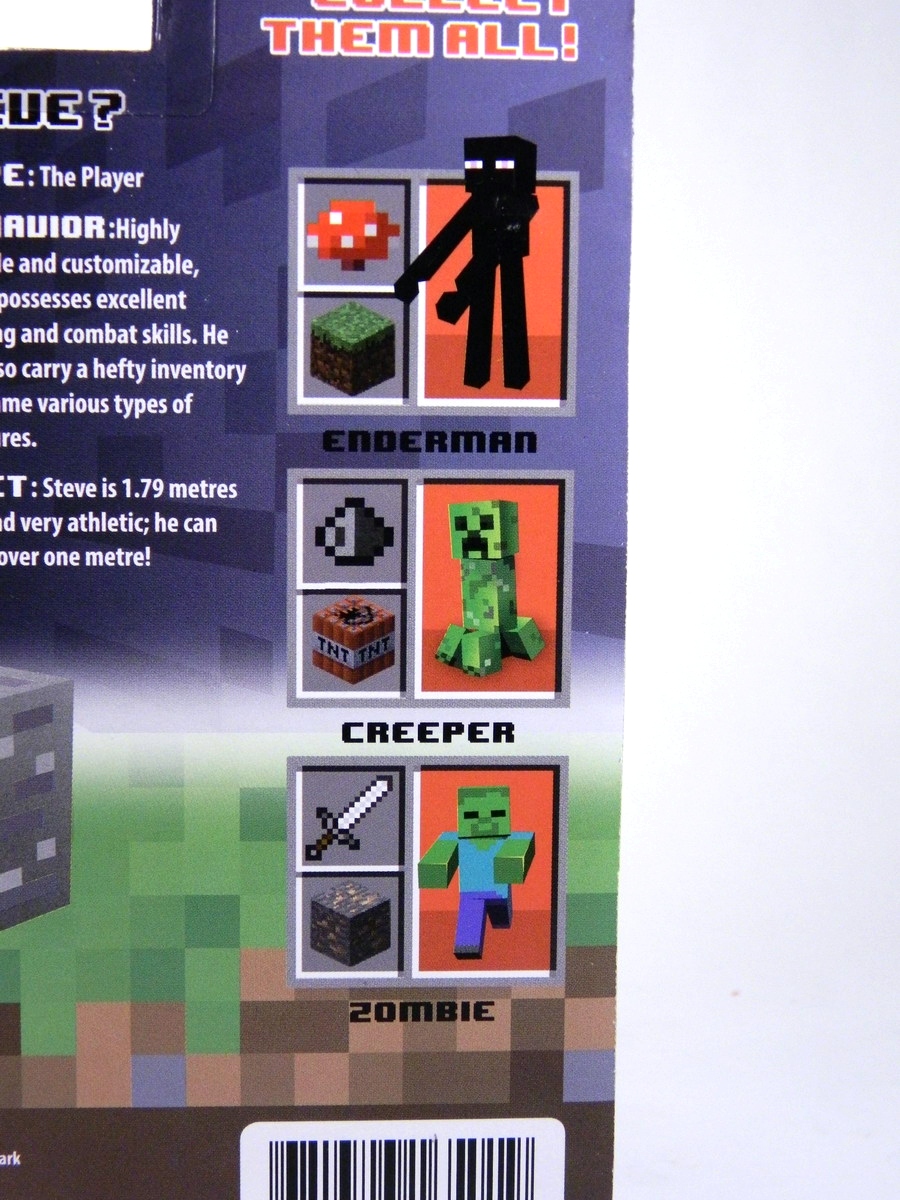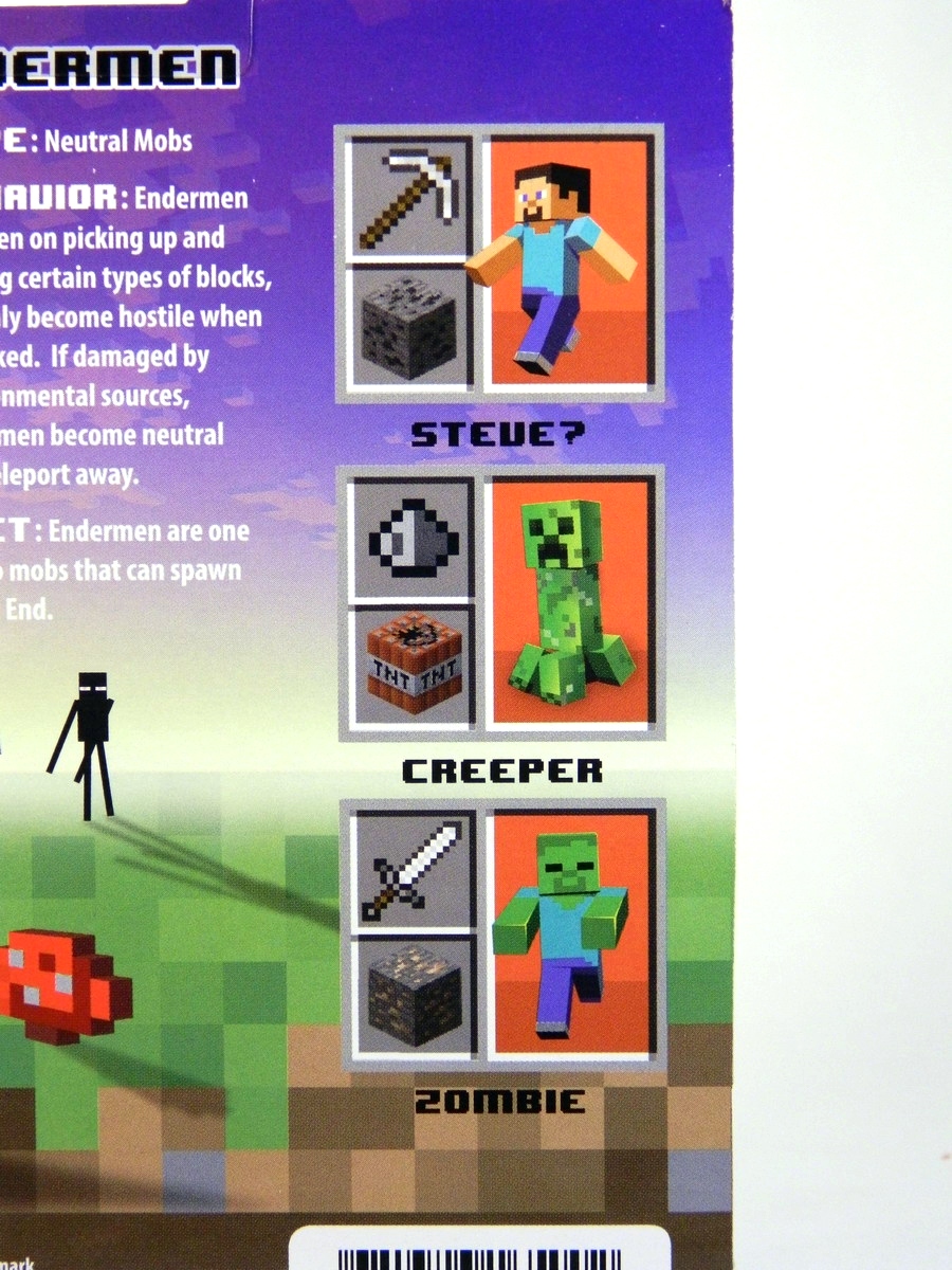 For those that want a more deluxe Steve action figure, there is also a slightly more expensive ($15.99 at TRU) Core Player Survival Pack (pictured top). This set includes Leather Steve (to my untrained eyes it looks the same as the single release), Workbench, Pick Axe, Sword, Bed, Chest, and Torch. Check out our photo gallery below for images of all these new figures, including new in-package shots of Steve and the Enderman (I bought them for my nephew- one of Minecraft's biggest fans).