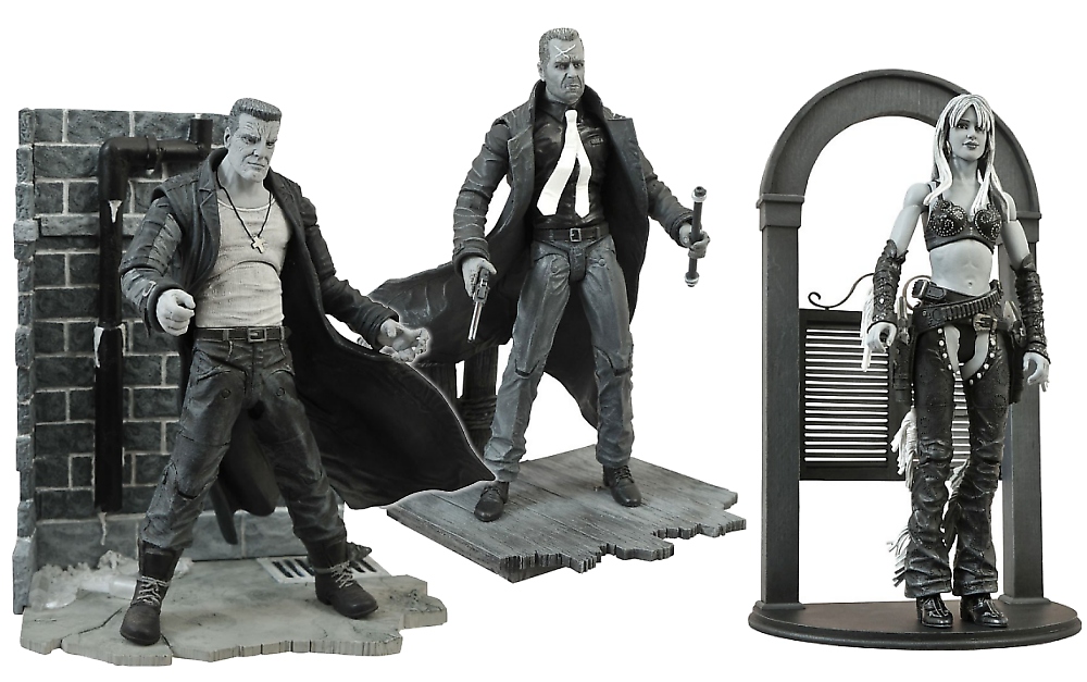 Walk down the right back alley in Sin City and you can find anything, but you don't need to live in Sin City to get high-quality Select action figures of the movie's main cast! The first series of 7-inch-scale, fully poseable figures from DST includes Marv, Hartigan and Nancy, all based on their appearances in the 2005 feature film. Each figure comes packaged with a deluxe display base and accessories in the famous Select display packaging, complete with spine reference artwork. Sculpted by Jean St. Jean.