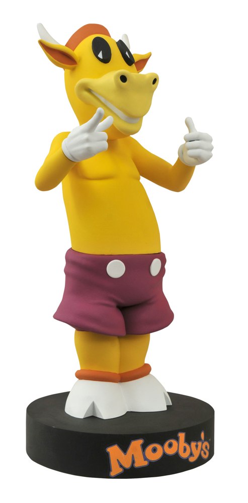 Who's a friend to the king of all the monkeys? Who's a pal to the duck who won't fly south? It's Mooby the Golden Calf! This fast-food mascot turned children's entertainment fixture is now a 10-inch vinyl bank! With a slot on his back and an access door underneath, Mooby will keep your spare change safe inside his profit center. (SRP $22.99, item #FEB142052)
