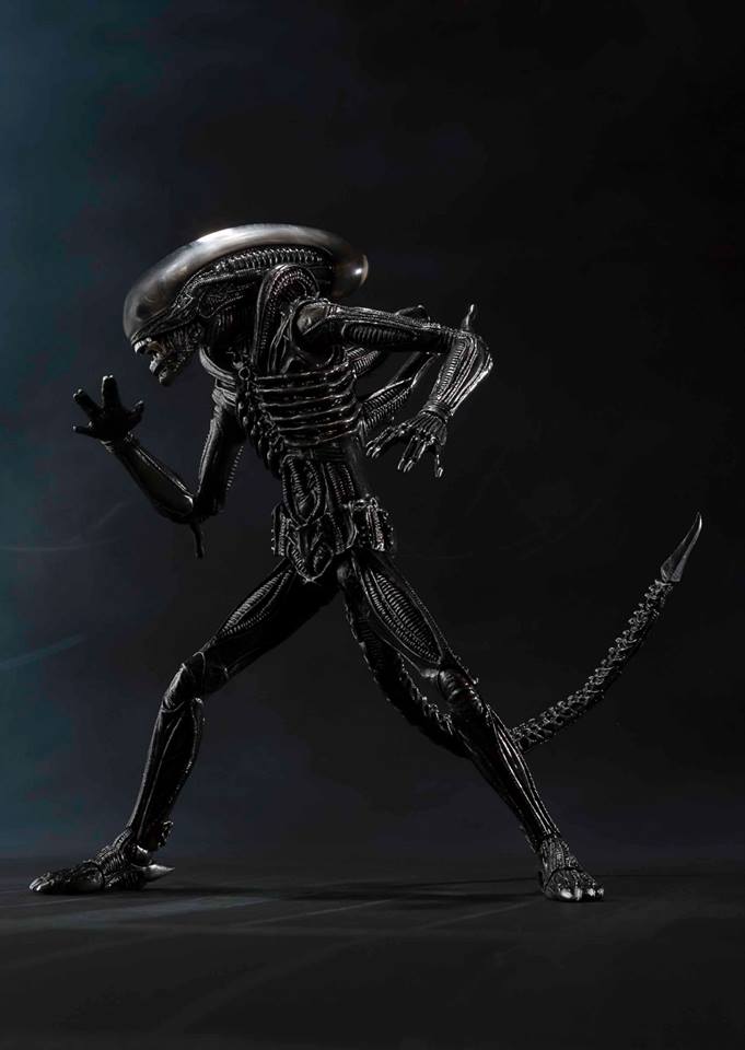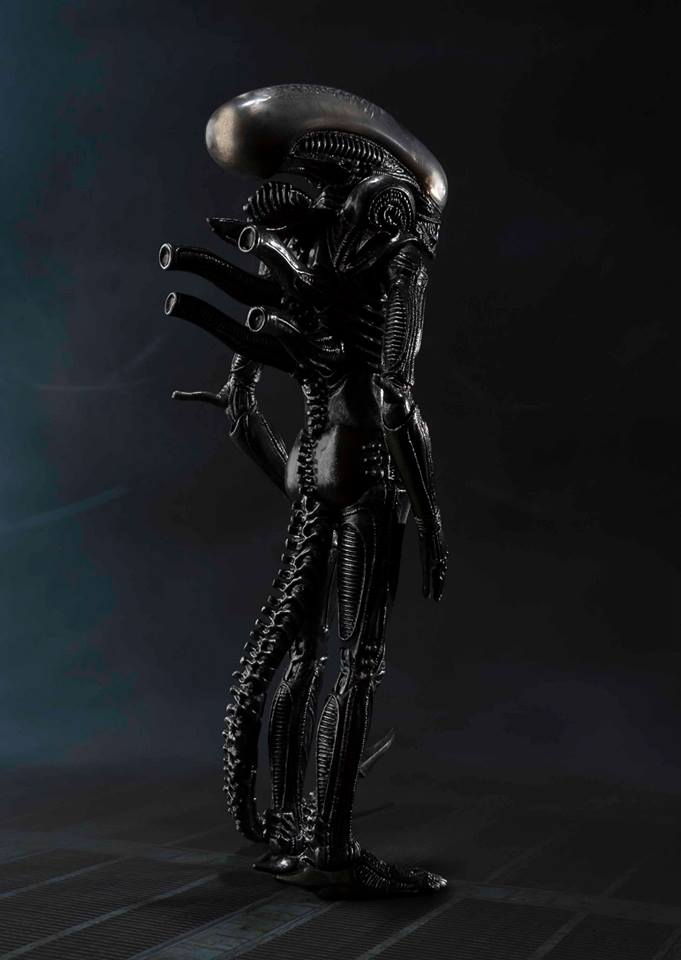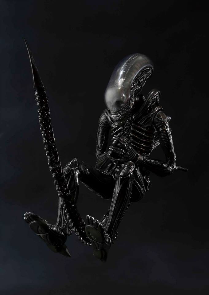 Developed from the ground up to replicate poses from the Alien film the overall style dictated by the long arms and legs of the actor inside the suit, and the finely detailed sculpting of the suit itself as designed by Geiger, are replicated in the product in exquisite detail. Big Chap's distinctive translucent head carapace is rendered with a separately-molded semi-translucent part, allowing the precision-sculpted skull beneath to show through. The bone-like tail is built from 18 individually jointed segments for enhanced detail and the tip employs die-cast metal for enhanced weight and realism. Figure set also features interchangeable hand parts and special display stand.