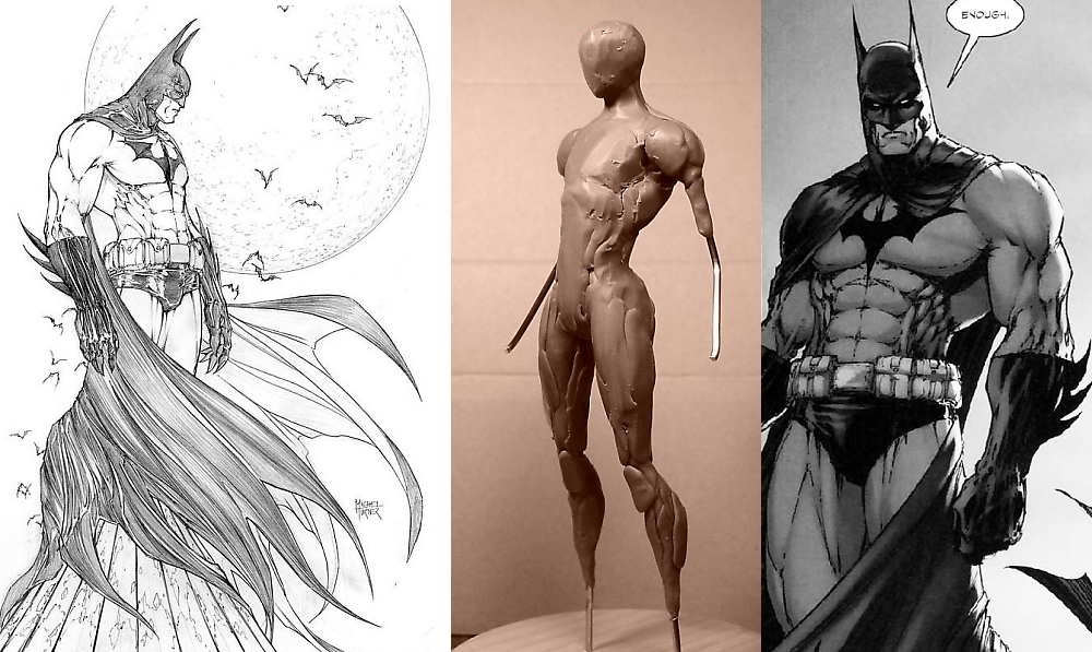CS Moore Studio announces that Clayburn Moore will be sculpting a statue of Michael Turner's interpretation of Batman for DC Collectibles' Black and White series. Pictured above are a couple of Turner's drawings that inspired the piece as well as a look at the preliminary armature for the statue. While an early sculpt with only very basic anatomy, the attitude of the figure is starting to come through.