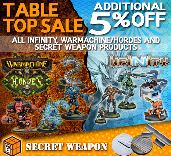 Going on right now at our sponsor Miniature Market is a new Table Top Sale! Already low prices are slashed an additional 5% on all Infinity, WARMACHINE, HORDES, and Secret Weapon products. This is a limited time offer, and the sale will end this Thursday at midnight CST. When you're done shopping just enter code TKEFV at check out for your additional 5% savings! Let 'em know CritToHit sent you, and go get some great deals at Miniature Market now.