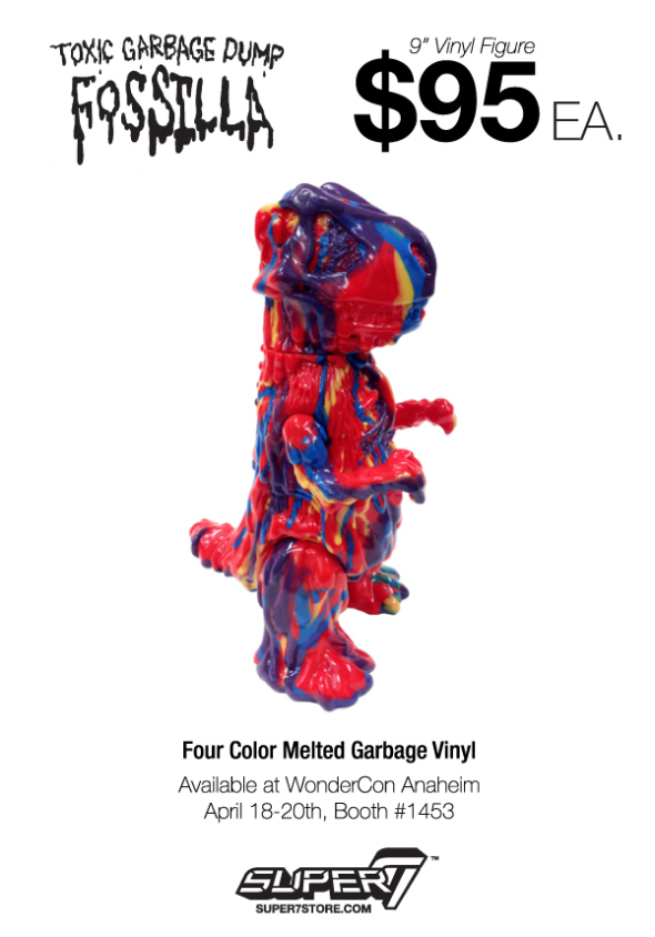 An ancient, fearsome beast rests deep underground – until it is lurched from its slumber by a foul substance, oozing down from above. Thus the Toxic Garbage Dump Fossilla is born! The mighty beast defies all logic of exhistence with his half-decomposed body lumbering in vengeful rage! Cast in four color melted drip vinyl, blood red, putrid purple, shocking blue, and bile yellow, each monstrous monstrosity is a unique, one-of-a-kind cacophony of color! $95 ea.