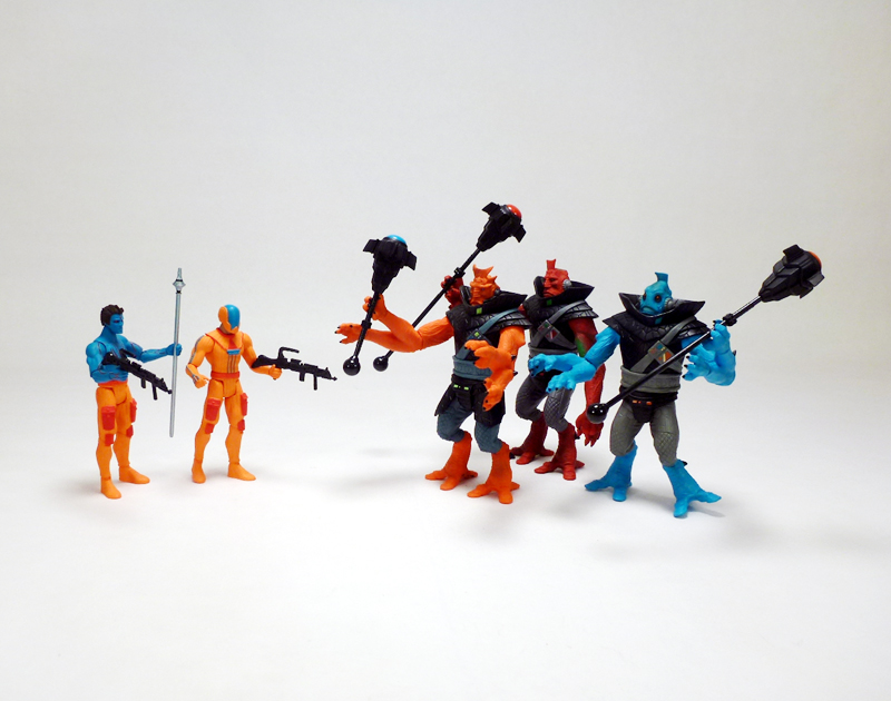 Previously released versions of Arkus’ elite warriors started with the slightly more than two tone pink and purple Ggrapptikk Grunt and got more decorative with the subsequent green Ggrapptikk Grunt and Barlowe Color Concept Ggripptogg. These new aliens take it to “11” with full paint apps and differentiating colors. All three share the same black on their outfit, while Ggripptogg and Ggrapptikk also have the same gray on their pants, belt, and sash. Each has a unique skin tone and eye color with black spines and claws; Ggrabbtargg is a bright orange with black shading and blue eyes, Ggrapptikk is an aquatic blue with green accents on its head and bright orange eyes, and Ggripptogg is a dark red with green accents on arms and head with green eyes. Different colors appear on the warriors’ sash-mounted control panels, loincloth, and the one colored panel on their collars. The overall result is three figures who look very different despite sharing most of the same parts, and they’re pretty awesome.