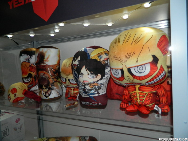 Yes Anime is also expanding with several new series of Trexi figures capturing anime characters! Prototypes on hand featured Tiger & Bunny (which are in production right now), Naruto (which they're still tweaking - including adding the split toes), Death Note, and Bleach. One important thing to note about these new Trexis is how much new tooling was involved; instead of sticking with the standard round head and painted hair they've gone with all new sculpts of hair, helmets, etc. Look for the first releases around the holidays. Side by side with the Tiger & Bunny Trexis were the stuffed 12" Alpacas from that series, which look absolutely adorable. Also in the anime section was a collection of Attack on Titan plush items made possible through a deal with FUNimation. From Yes Anime you'll see plush cylindrical pillows, gloves, body pillows, mallets, and more. The Colossus Titan plush will be limited to only 500 units (across all sizes) in the US, so make sure you grab 'em when they go on sale.