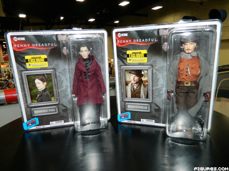 Continuing with the 3 3/4 inch trend is the Venture Bros. with another SDCC exclusive Brock variant (bloody black shirt), and the SNL cartoon Ambiguously *** Duo also appeared in San Diego for the first time with an exclusive tin set with figures of Ace, Gary, and Bighead. The animation domination adds upcoming Adult Swim cartoon Mike Tyson Mysteries with an 8 inch retro Mike figure; the SDCC exclusive came with gloves and a jacket without a hood while the retail version will have a hooded jacket and no gloves. Also in 8" retro figures are the final two Six Million Dollar Man figures of astronaut Steve Austin and the Seven Million Dollar Man Barney Miller. Totally new and innovative for BifBangPow are upcoming nesting doll sets starting with Adventure Time, and most likely expanding into their other familiar properties. Also new are products from the new Showtime series Penny Dreadful. Those launched at SDCC with exclusive figures (later retail releases will have different outfits) and a very cool tarot card set directly from the show.