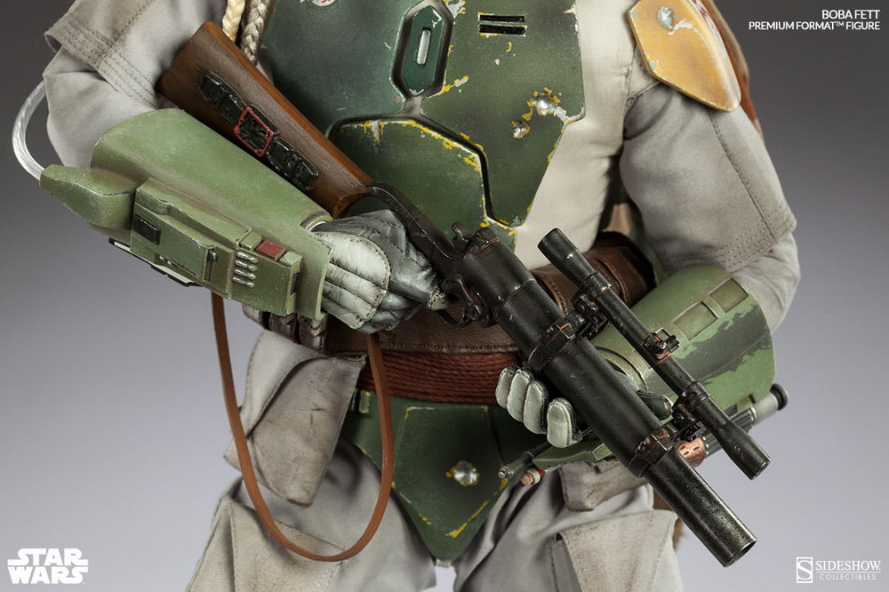 Arm Boba Fett with his BlasTech Industries EE-3 Blaster Rifle Mark II swap-out accessory, available only with the Sideshow Exclusive Edition (shown below).