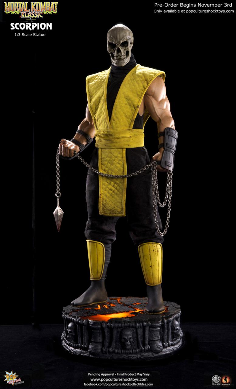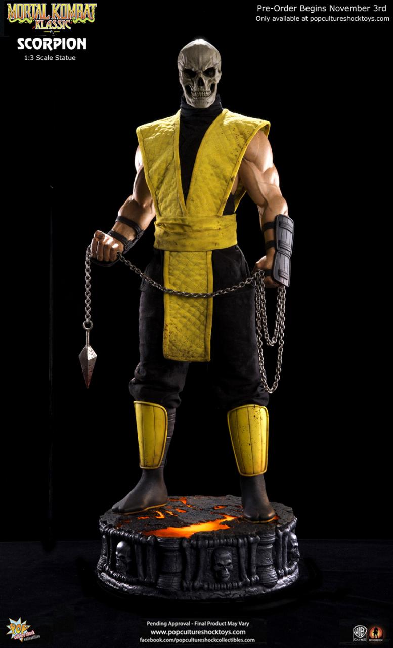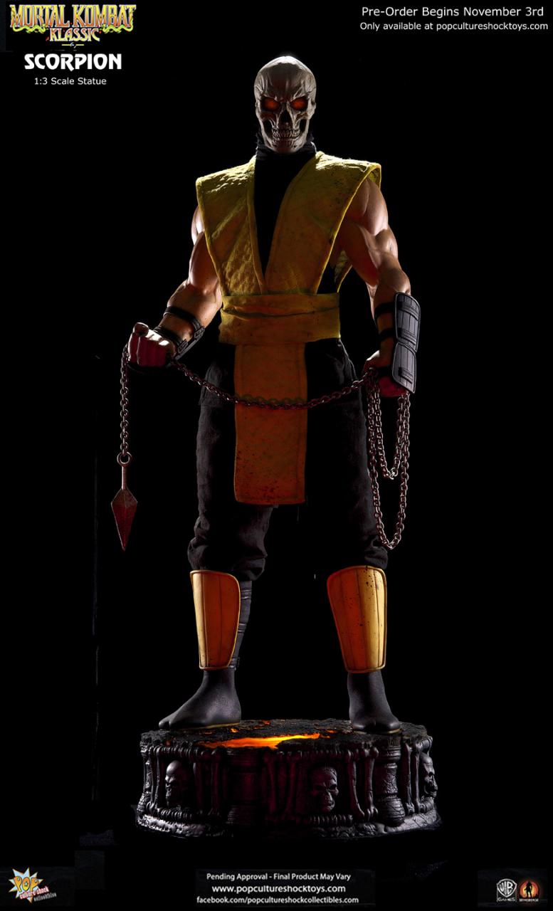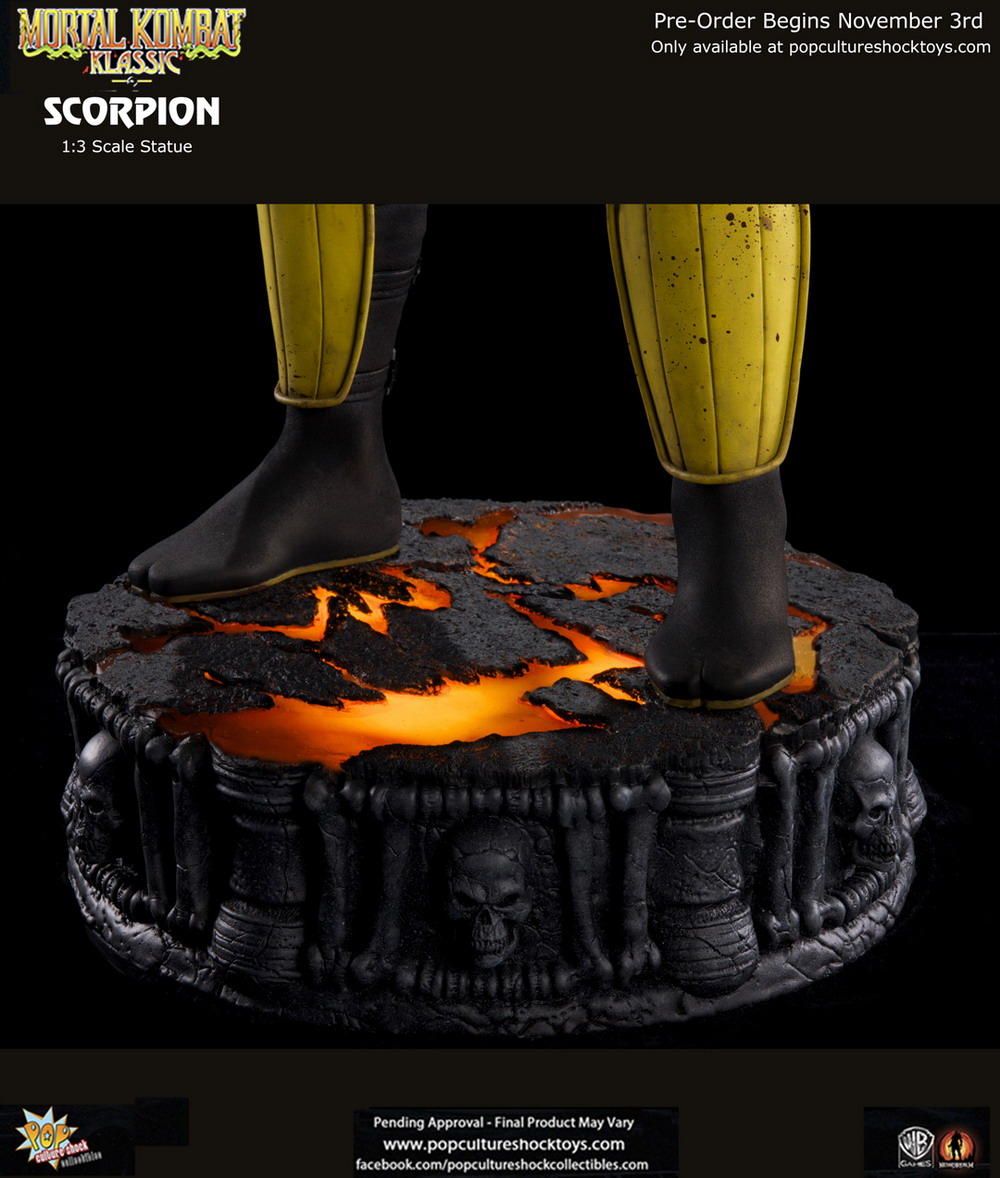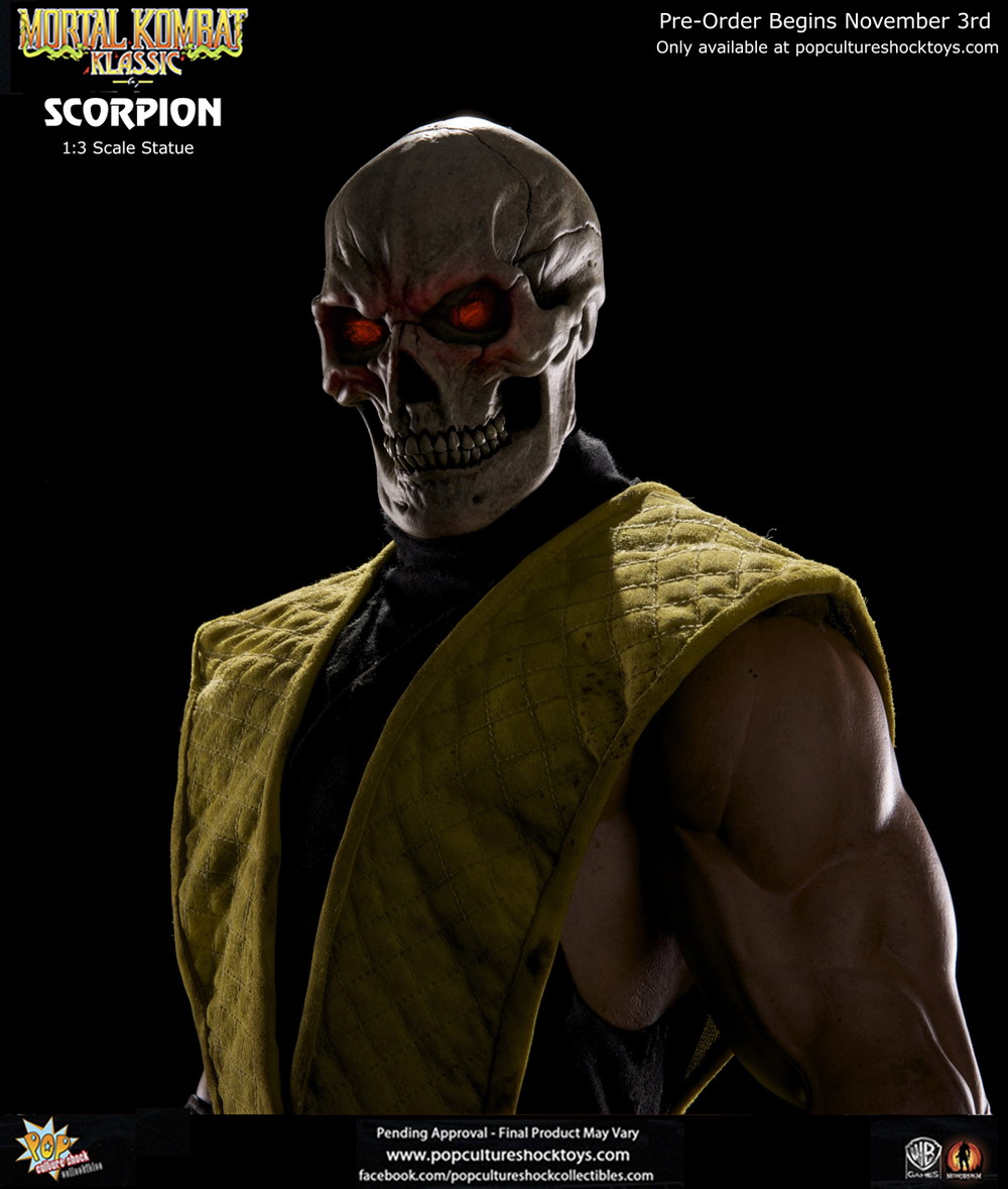 Pop Culture Shock has released new photos of their newest Mortal Kombat statue: Scorpion. This massive 1:3 scale mixed media masterpiece stands 28" (71cm) tall, features a tailored cloth costume, real metal chain, light-up LED base and switch-out Skull Head with LEDs (pictured below). Limited to only 250 pieces wordlwide, this is destined to be a highly sought after collectible. Pre-orders start on Monday, November 3rd at 3pm Pacific. The Klassic Scorpion statue will be priced at $699.99 with shipping expected in the fall of 2015.
