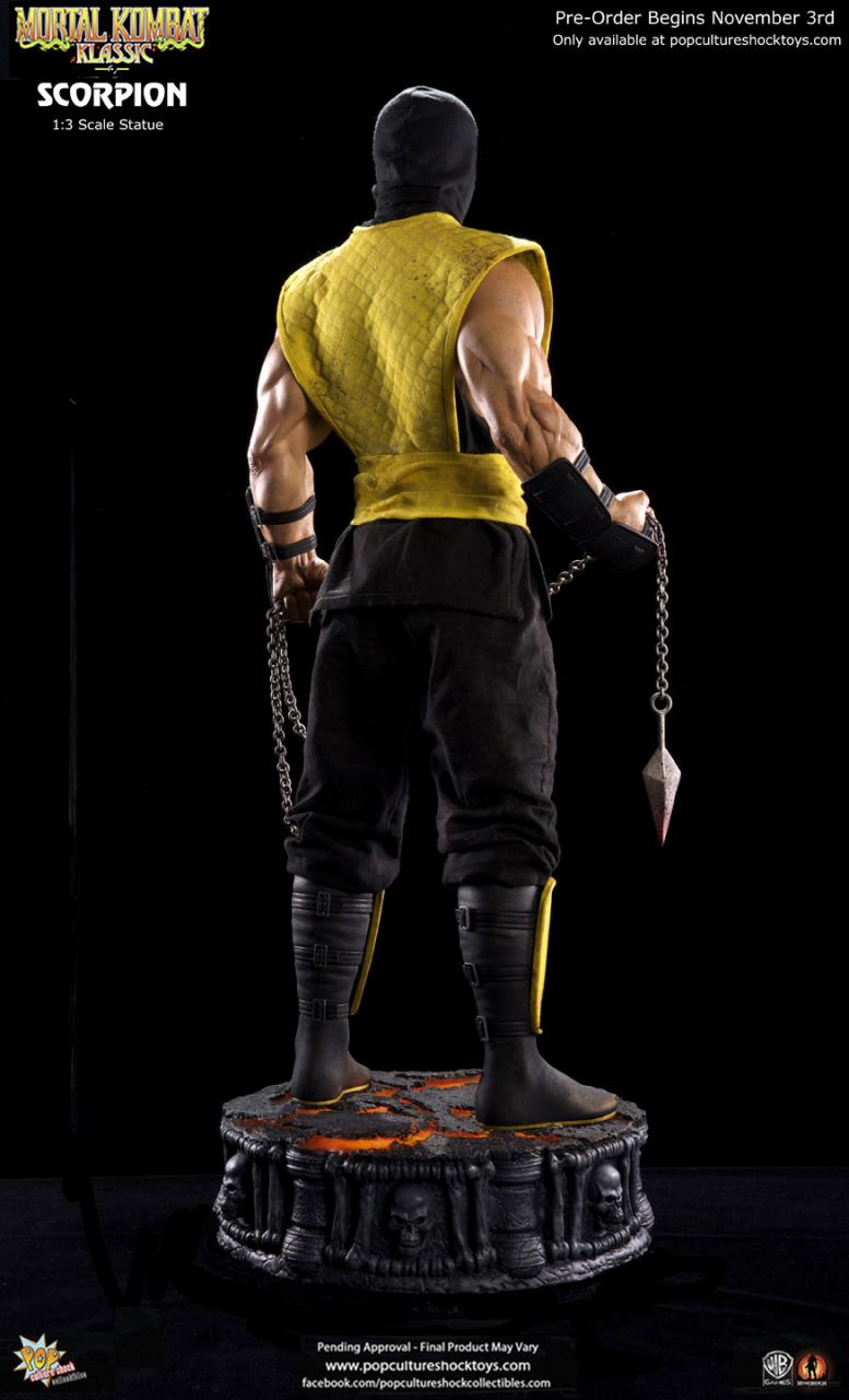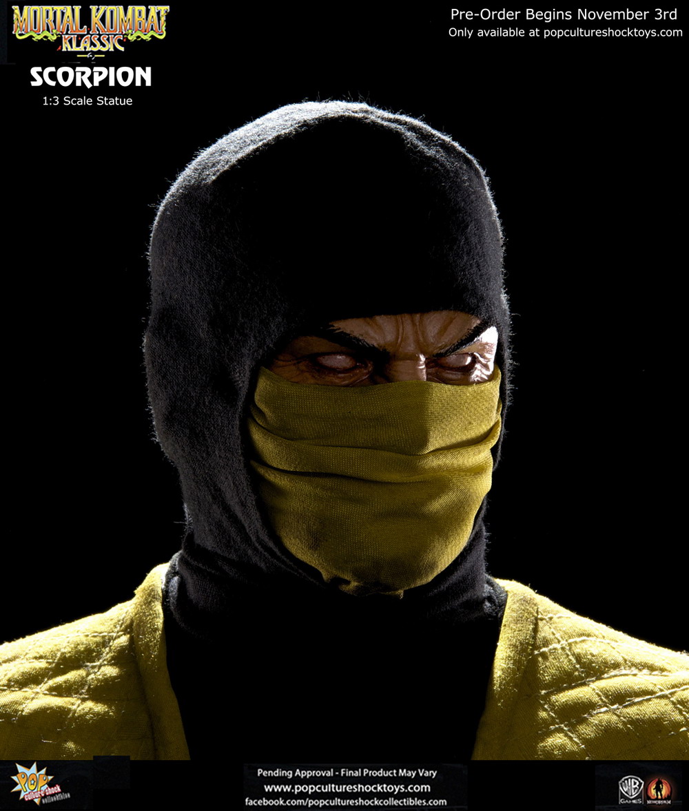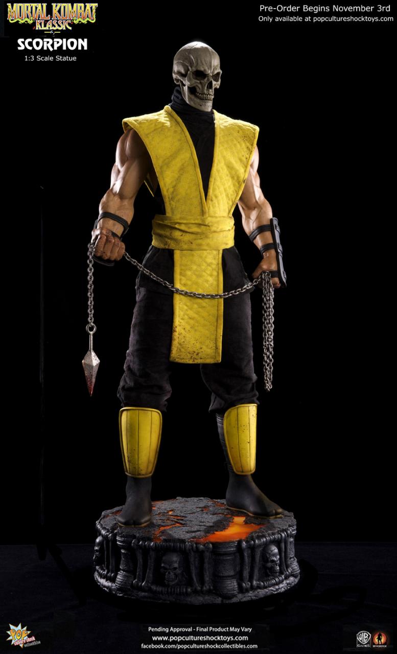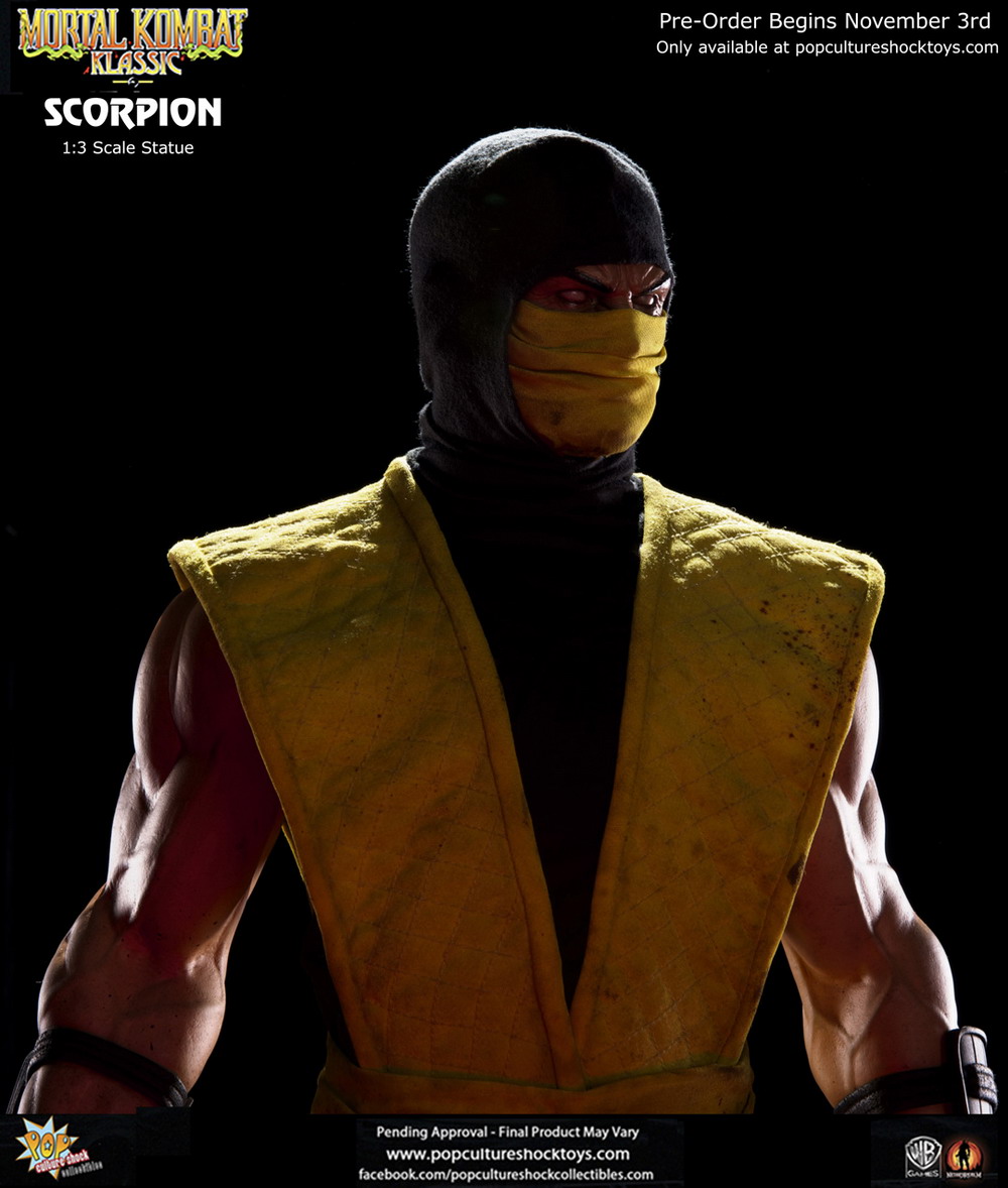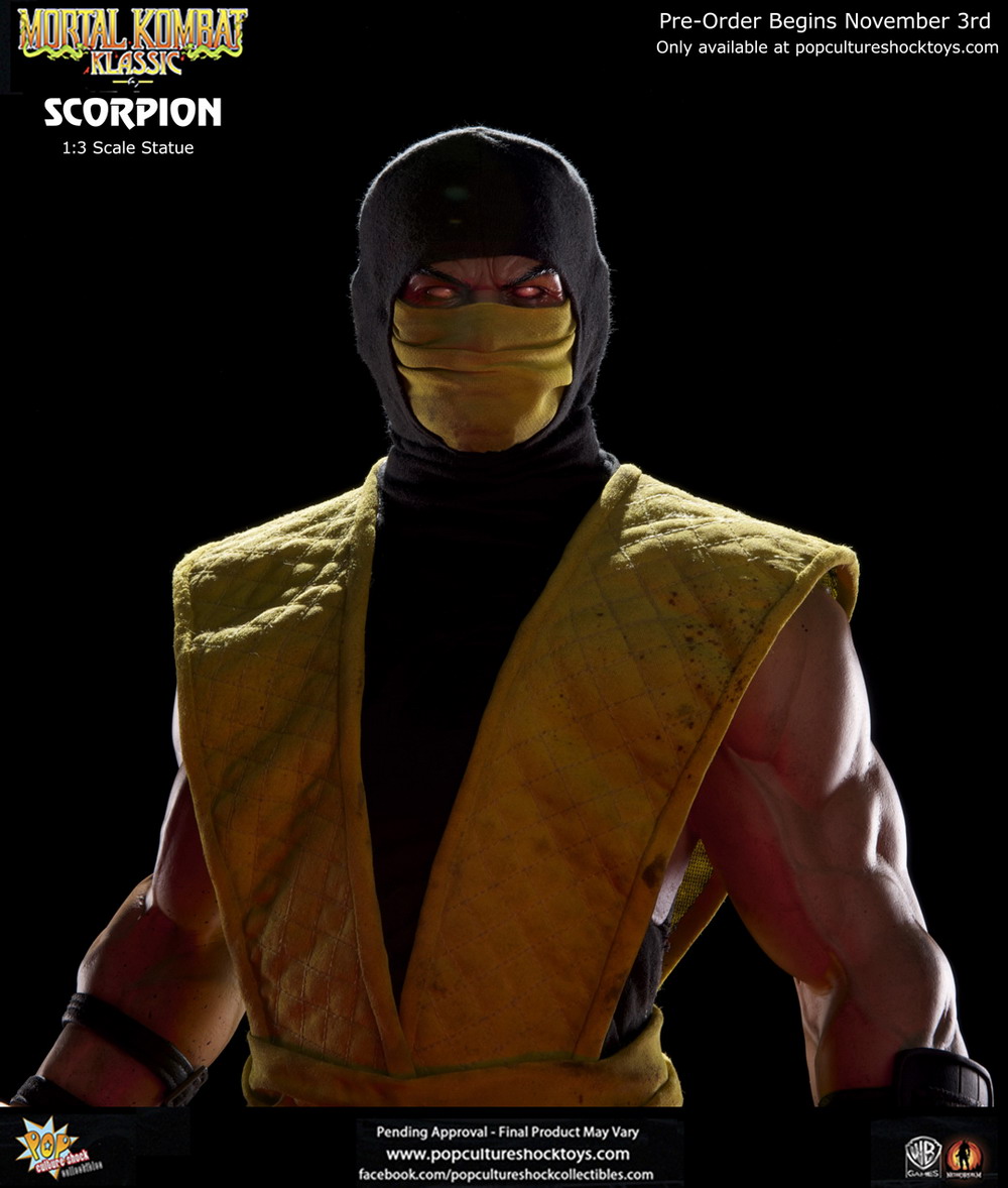 Pop Culture Shock has released new photos of their newest Mortal Kombat statue: Scorpion. This massive 1:3 scale mixed media masterpiece stands 28" (71cm) tall, features a tailored cloth costume, real metal chain, light-up LED base and switch-out Skull Head with LEDs (pictured below). Limited to only 250 pieces wordlwide, this is destined to be a highly sought after collectible. Pre-orders start on Monday, November 3rd at 3pm Pacific. The Klassic Scorpion statue will be priced at $699.99 with shipping expected in the fall of 2015.