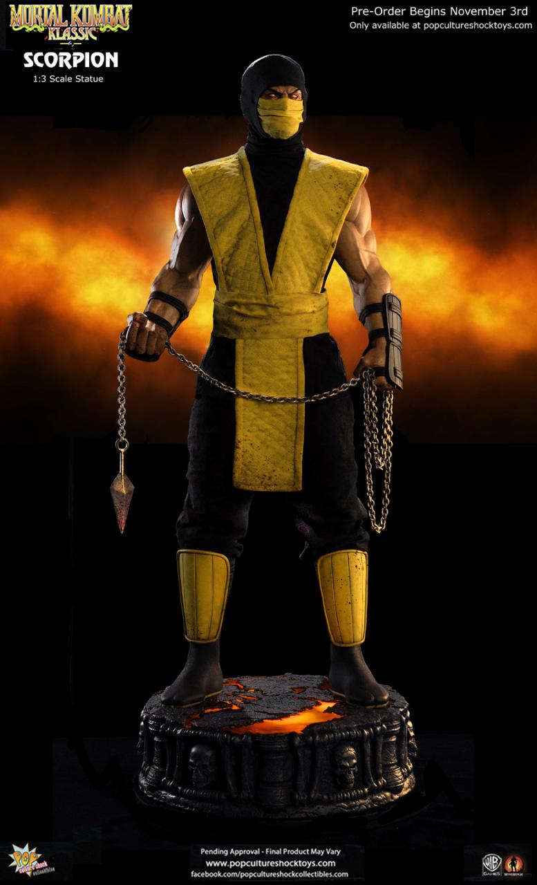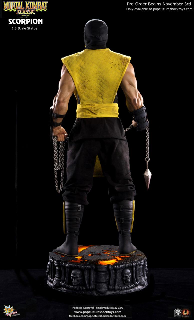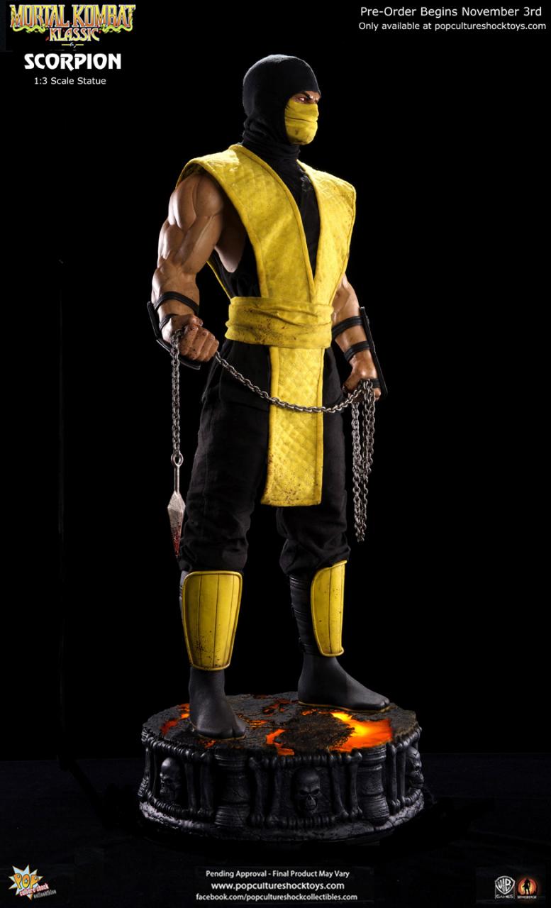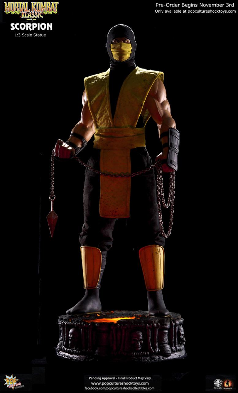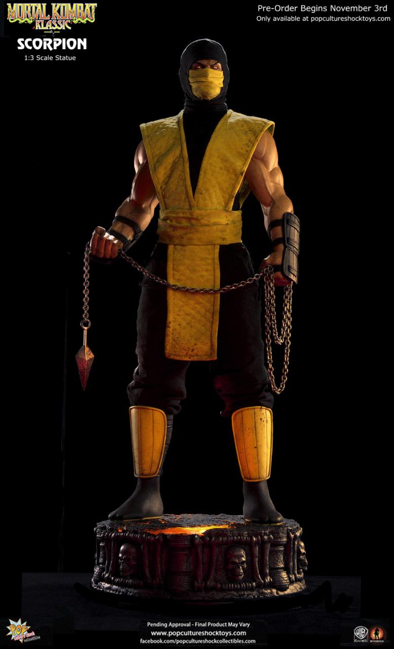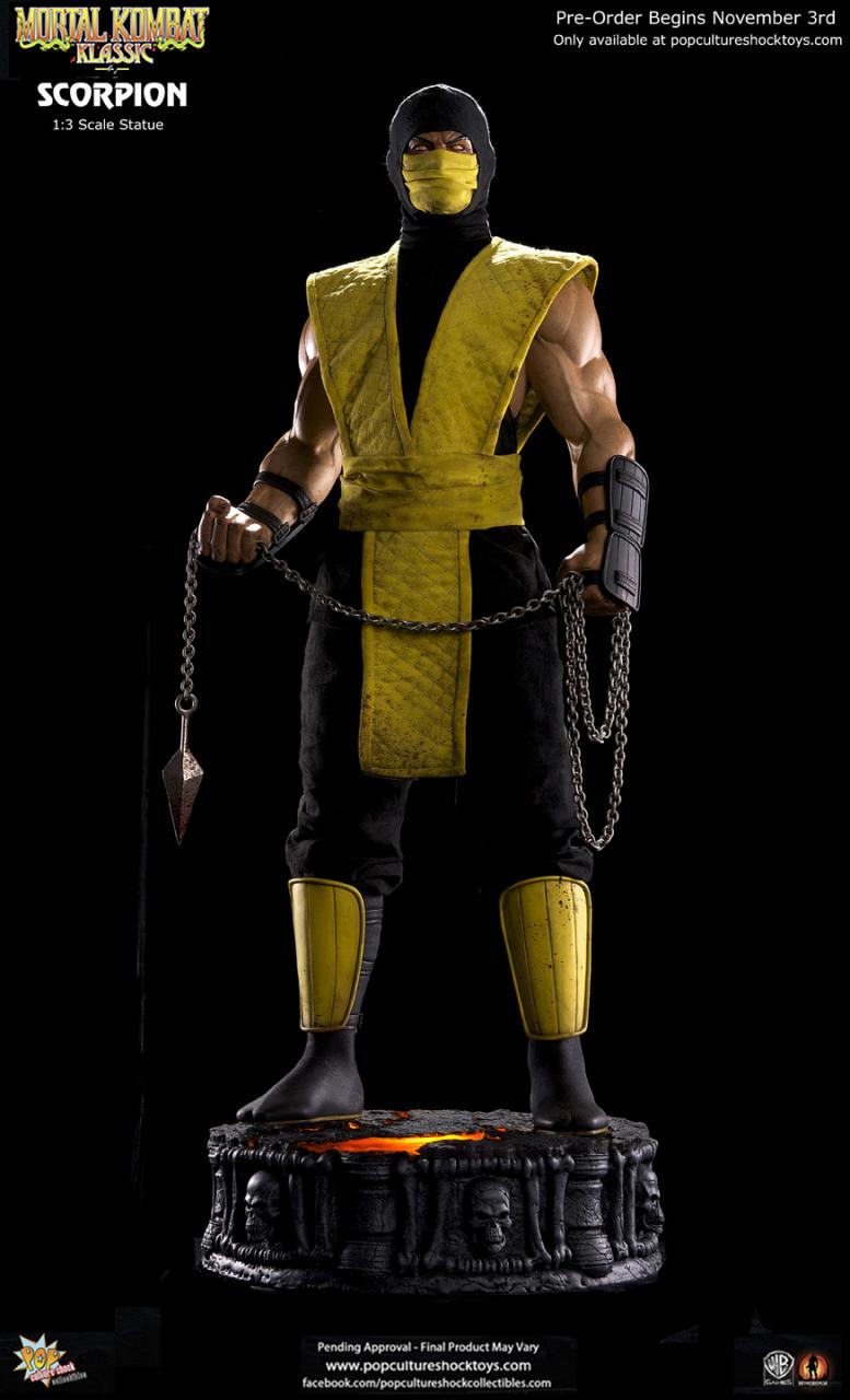 Pop Culture Shock has released new photos of their newest Mortal Kombat statue: Scorpion. This massive 1:3 scale mixed media masterpiece stands 28" (71cm) tall, features a tailored cloth costume, real metal chain, light-up LED base and switch-out Skull Head with LEDs (pictured below). Limited to only 250 pieces wordlwide, this is destined to be a highly sought after collectible. Pre-orders start on Monday, November 3rd at 3pm Pacific. The Klassic Scorpion statue will be priced at $699.99 with shipping expected in the fall of 2015.