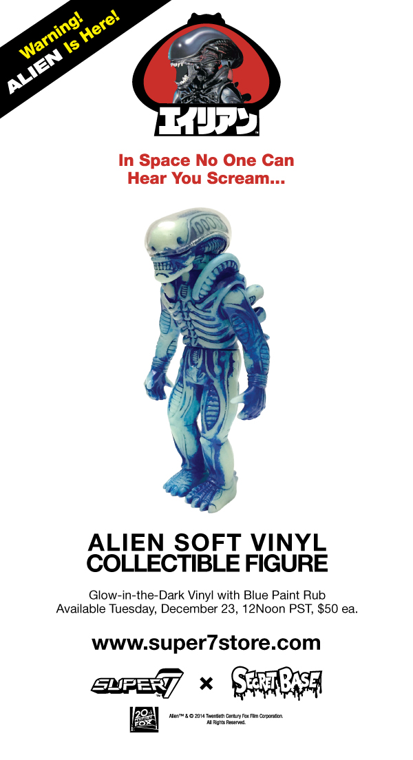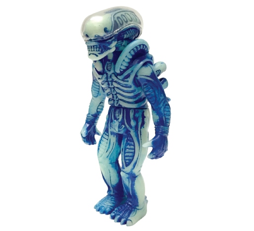 The Alien Soft Vinyl figure from Super7 and Secret Base returns with a new glow version (see Black Glow HERE). This version of the 4" tall terror is cast in Glow-in-the-Dark vinyl with a sinister BLUE paint rub treatment.