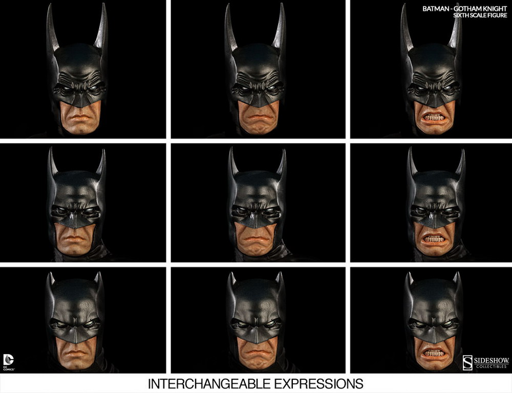 Crafted on a fully articulated muscular body design, our hero is disguised in a grey and black tailored Batsuit and cape. Inspired by a number of timeless comic book appearances, the Batman "Gotham Knight" Sixth Scale Figure invites collectors to further define their favorite look for the Caped Crusader with three cowl and mask options and three interchangeable facial expressions (pictured below), which are also compatible with Sideshow’s Batman Sixth Scale Figure.