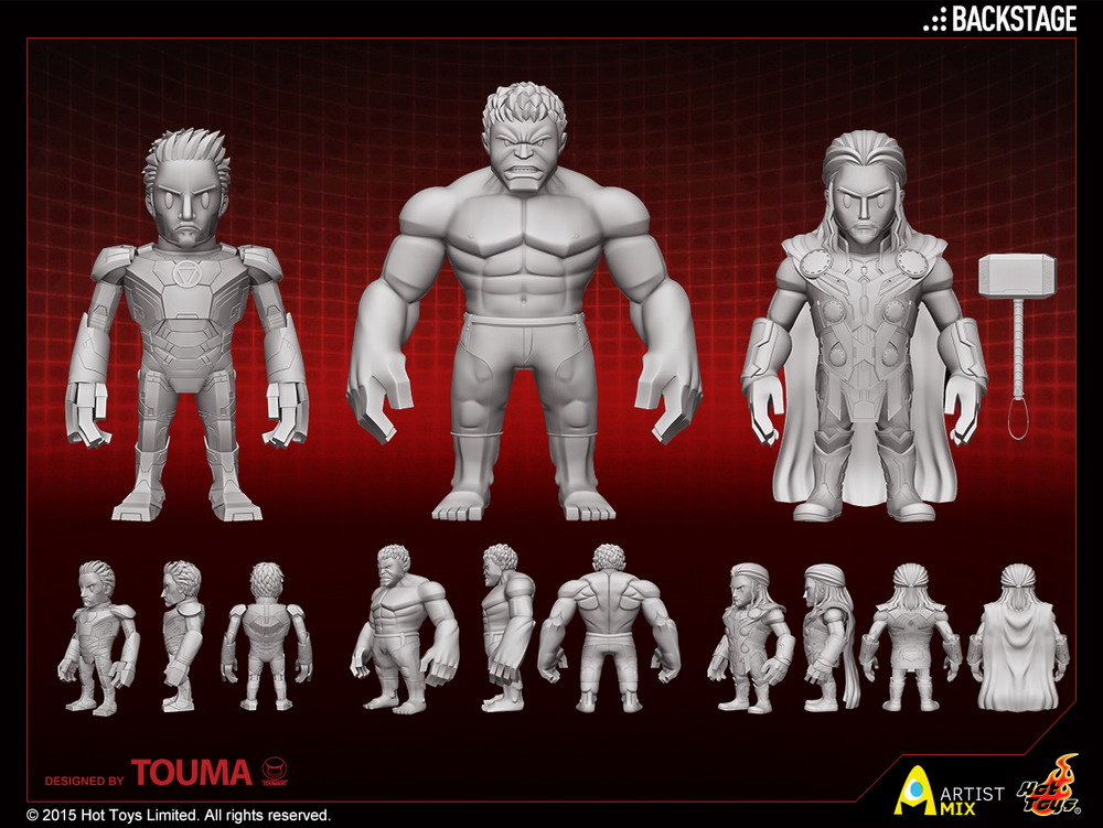 Hot Toys gives collectors a 3D rendered graphic sneak peek at the lineup for their second assortment of Marvel’s Avengers: Age of Ultron Hot Toys Artist Mix Figures. Series 2, designed by TOUMA, continues the line with Tony Stark in Iron Man Mark XLIII suit, Hulk and Thor.