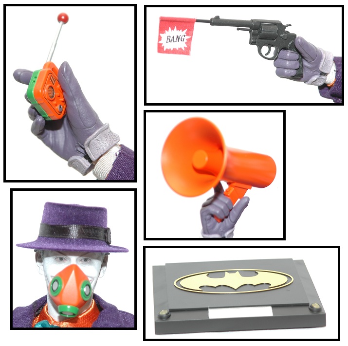 Each of these, along with the appropriate hand to hold them, helps make this figure film accurate. The variety of accessories provides a variety of display options. For those who liked the Joker's more malicious side, the chattering teeth are a favorite; for those who like the villain's more violent side, the long gun is always an option; and - of course - for those who want to display the hilarious side of the Clown Prince of Crime, there's the overcoat, acid flower, and cane.