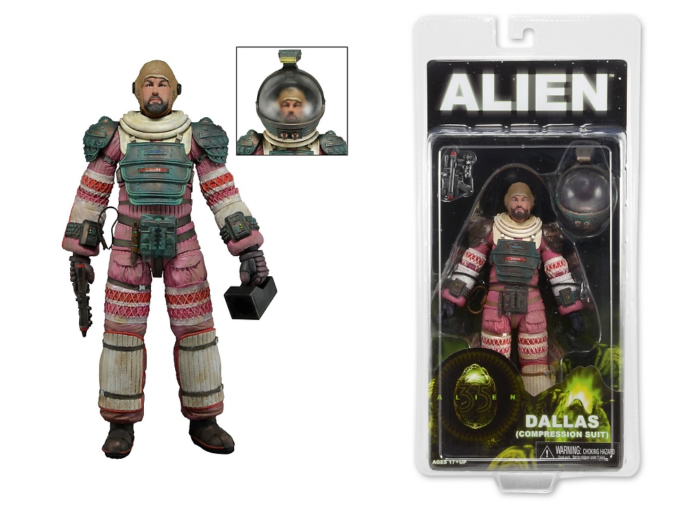 Ripley in Nostromo Jumpsuit comes with flamethrower and Jonesy the cat. Dallas in Nostromo Spacesuit comes with removable helmet, pistol and flashlight. Ripley in Nostromo Spaceuit comes with removable helmet, harpoon gun with two different attachments, and a frightened version of Jonesy the cat. Each fully articulated figure stands approximately 7″ tall and comes in special 35th Anniversary packaging.