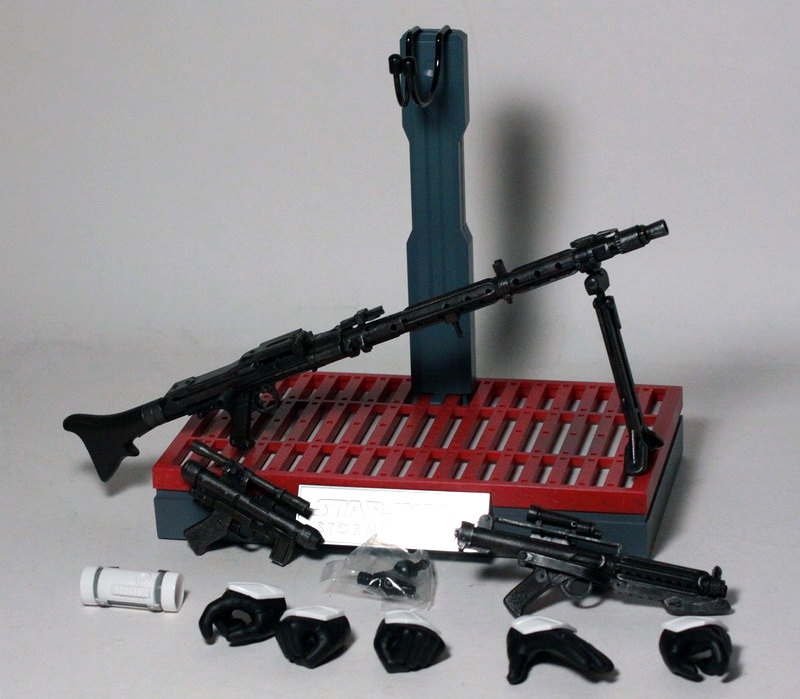 Each Stormtrooper also comes with a blaster rifle, blaster pistol, and a specially designed figure stand with Stormtrooper nameplate and movie logo. The stand holds up the figure at the crotch and has the ability to be tweaked to combine both stands together. All accessories listed so far are available with the standard single release.