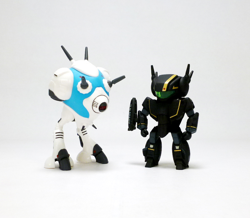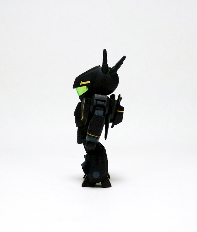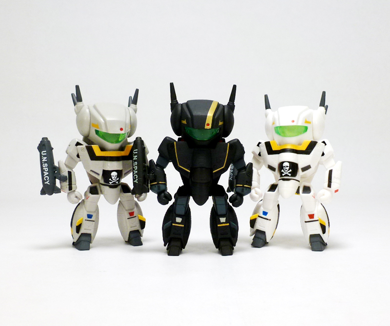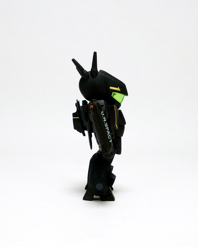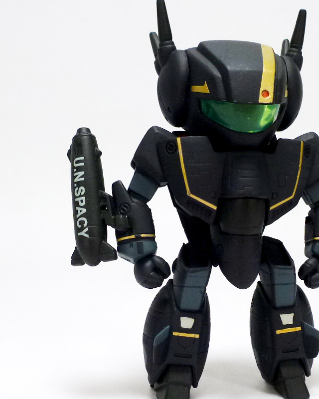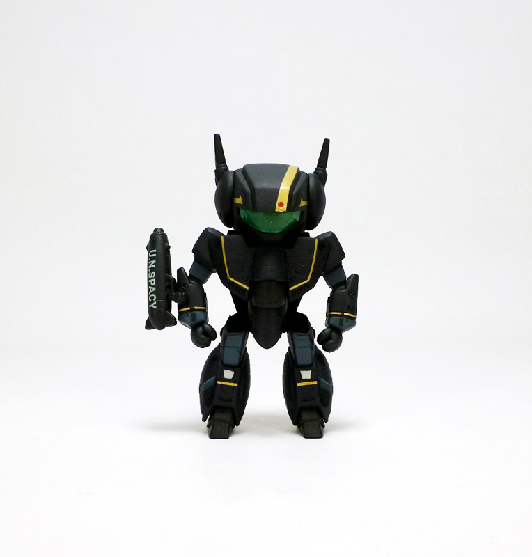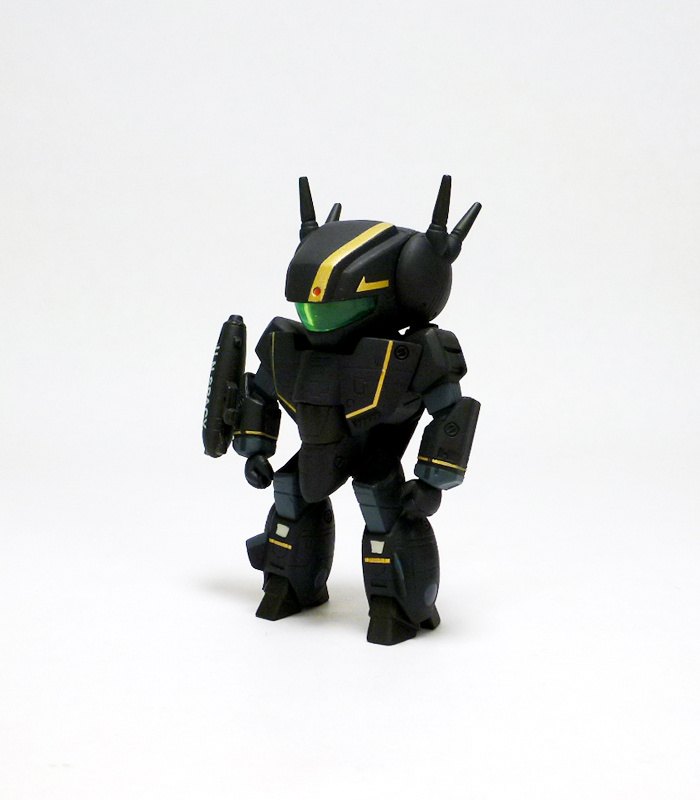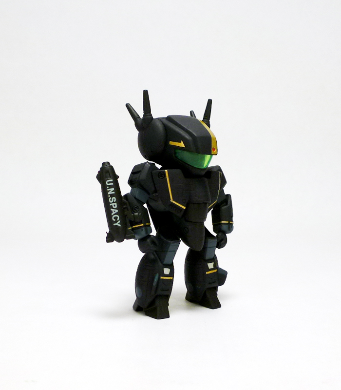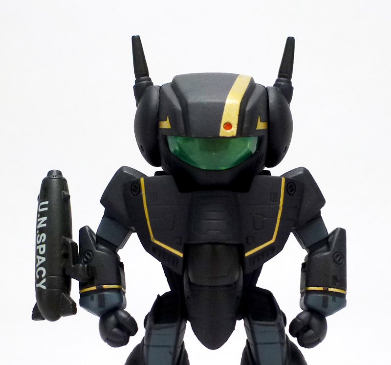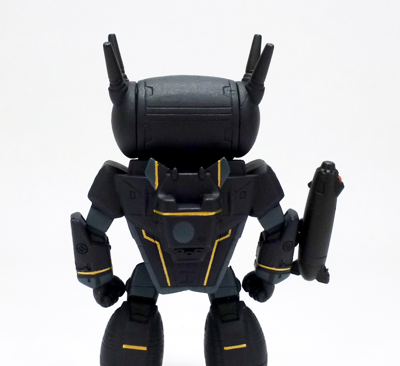 One of the cool things about Robotech was that all of the Veritechs were essentially the same, differing only in head styles and of course paint job. That became a huge boon for toy companies as it’s easy to repaint existing molds to create new units, and it’s perfectly accepted (and even demanded) by collectors. Aside from the different “hero” colorations one of the most popular Veritech variants sought after by fans is the “stealth” paint scheme, often achieved with black or dark gray. This year’s Super Deformed SDCC exclusive took the standard VF-1S mold and painted it mostly black with lighter gray sections on the limbs and bright contrasting details like gold lines, white lettering on the gunpod, a red dot on the Veritech’s “forehead,” and of course the really cool translucent green visor. It all looks great on this little guy, especially if you have the standard versions to pair with in their brighter white and muted gray.