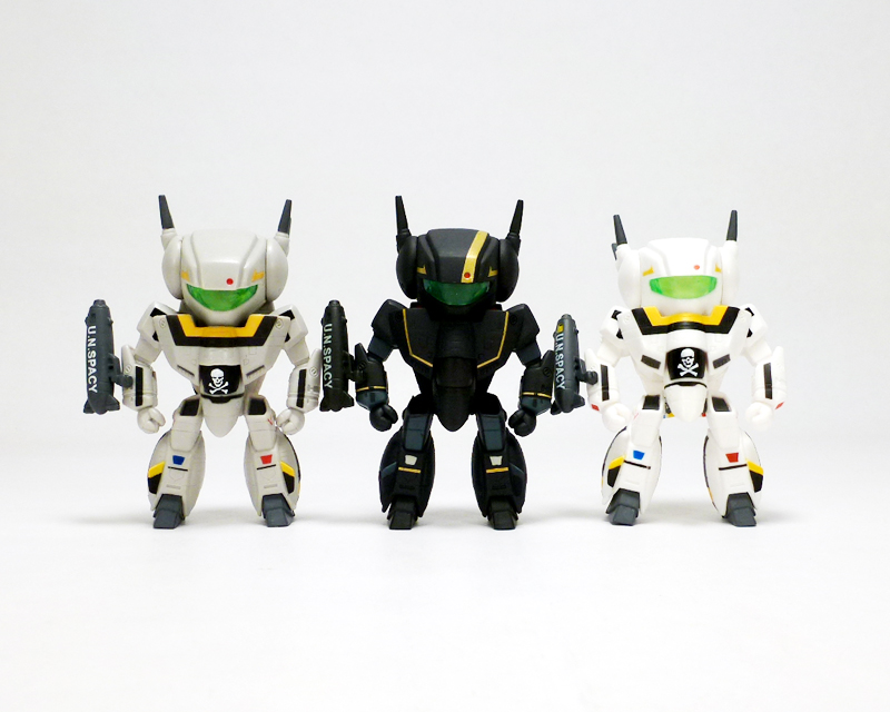 As I noted in our San Diego Comic-Con 2015 Team Survey, I was really happy with Toynami’s exclusive Robotech SD VF-1S Stealth Fighter toy. I’ve been a Robotech fan since the cartoon’s debut in 1985, and I’m always on the lookout for fun and interesting toys and collectibles of the awesome mecha... notably the Veritech Fighters. Toynami has been running with the Robotech license for a long time now, and recently reinvigorated the property with 30th anniversary products including 1/100 transforming Veritechs along with accessories and the blind box chibi figures released earlier this year. That set included three different Veritechs (Roy/Rick’s VF-1S, Miriya’s VF-1J, and Max’s VF-1S) in two styles (gunpod stowed on the arm or held) along with a Destroid, Zentraedi Battlepod, and two versions of a flightsuited Rick. Toynami actually debuted these figures first at San Diego Comic-Con last year with a pre-release variant of the VF-1S in gray, as opposed to the main set version in bright white. For Comic-Con 2015 they brought back the same mold, this time in a cool stealth paint scheme!