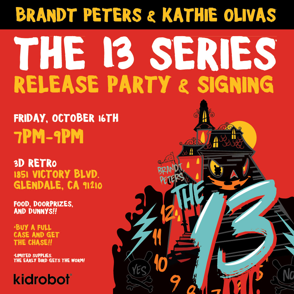 If you do... Join Kidrobot, Brandt Peters and Kathie Olivas on Friday, October 16th for The 13 Dunny Series release party and signing at 3D Retro! We'll have food, door prizes and The 13 Dunny series available for purchase! As an event special, a limited amount of chase pieces will be given with a purchase of the full case. This event will take place at 3D Retro in Glendale, CA from 7pm-9pm.