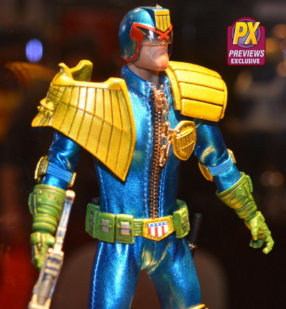The PREVIEWS exclusive Judge Dredd figure from Mezco’s high-quality One:12 Collective figure line has a comic accurate, digitally sculpted likeness, a silkscreened spandex uniform with a real working zipper, and interchangeable parts and accessories.