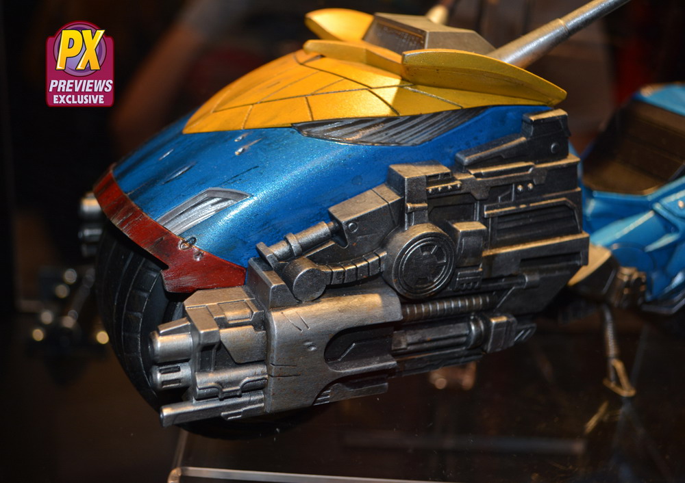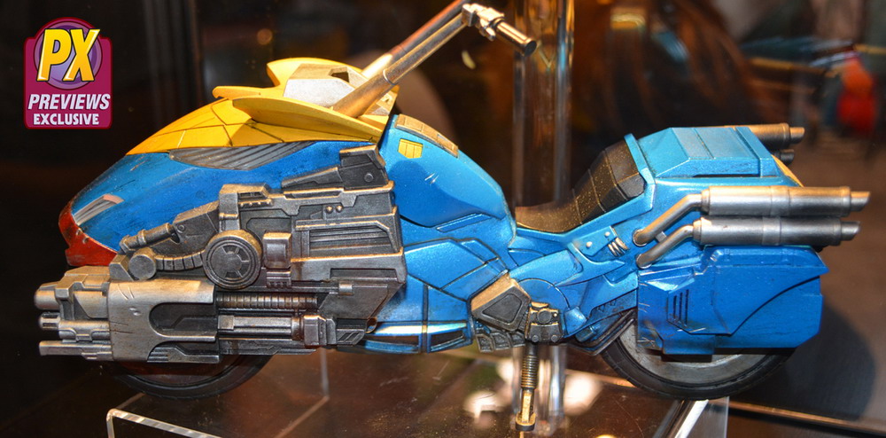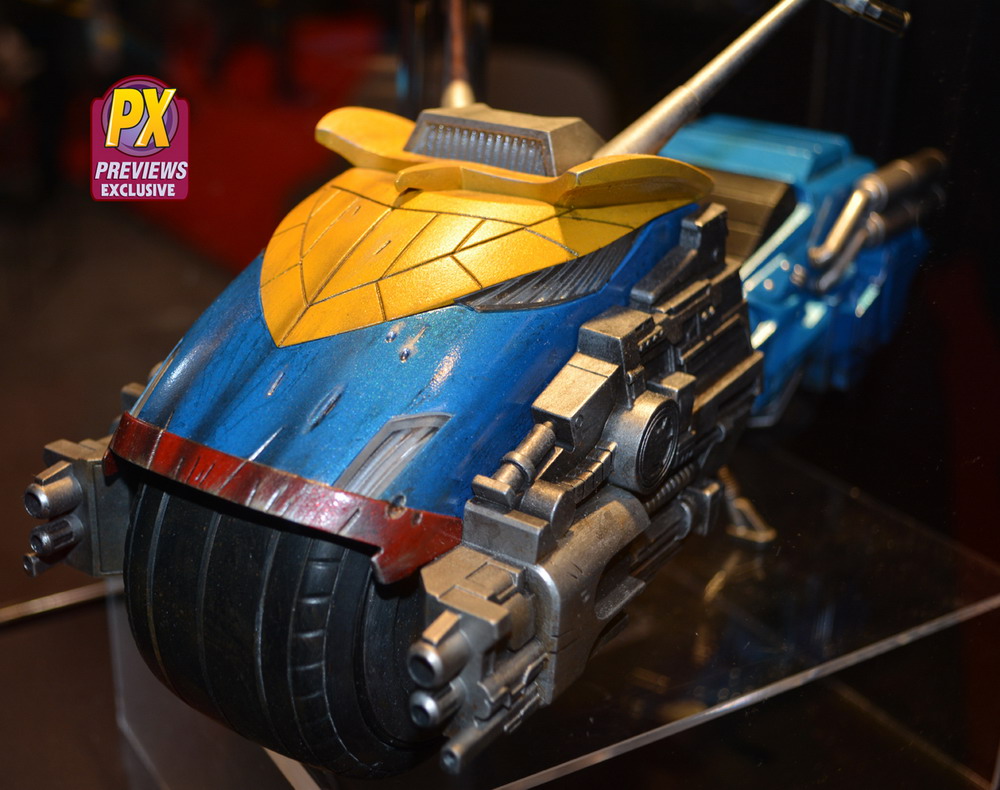 The Lawmaster bike, which was designed in cooperation with artist Ben Willsher, features three separate FX activated front guns with lights and sounds, activated motor sounds and lights, real rubber-slick tires, and storage that fits hand cuffs, free-rolling wheels and turnable handle bars, all with comic-accurate detailing.