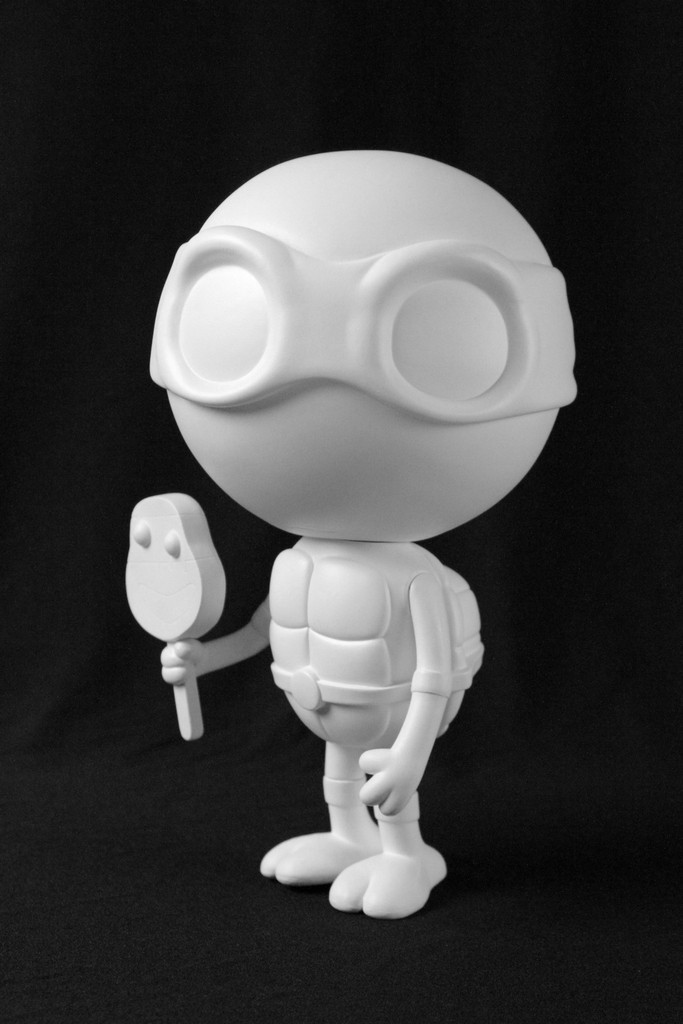 Mondo (mondotees.com) is now accepting pre-orders on a blank version of their first TMNT vinyl figure: Lil' Mikey (see our original story HERE). Based on artist Mike Mitchell's series, Just Like Us, Lil' Mikey is a direct translation of his take on Michelangelo. The 9-inch vinyl figure features an articulated head, and accurate TMNT ice cream on a popsicle stick.