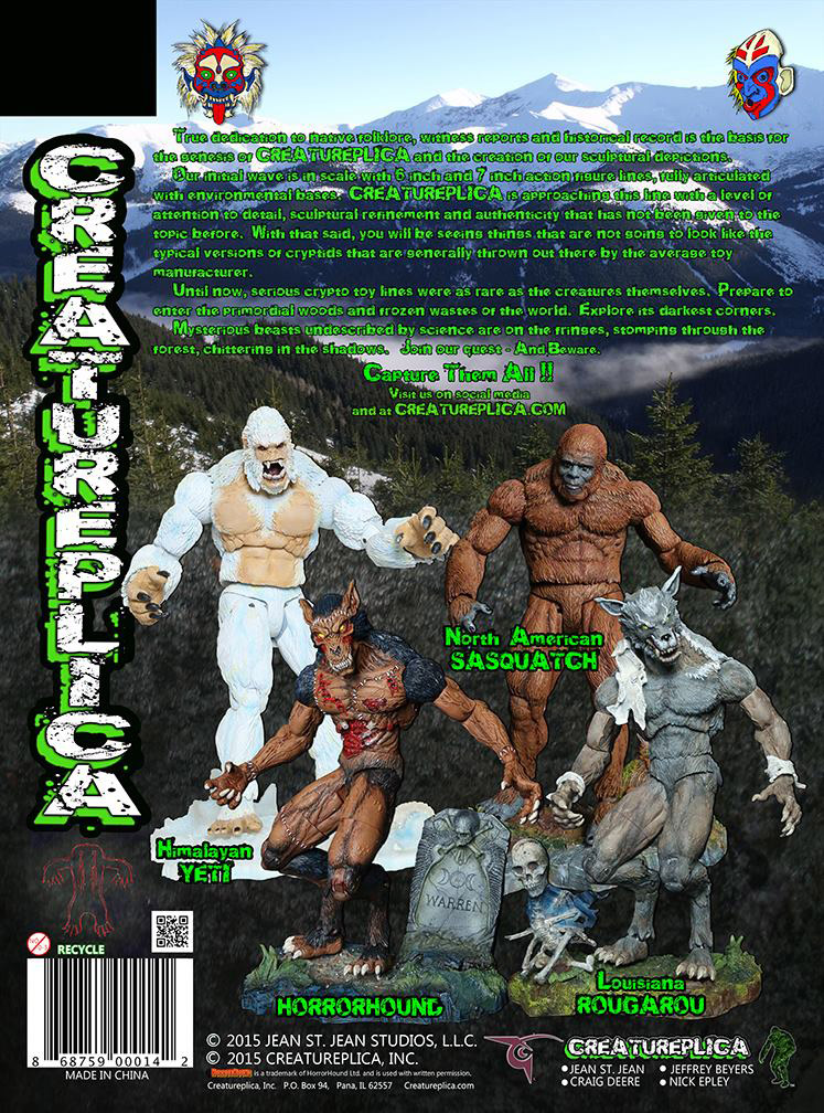 Creatureplica is an amalgam of creative and professional expertise headed by toy industry veteran sculptor/designer Jean St. Jean, in association with creative/financial collaborators, Jeff Beyers, Craig Deere, and Nick Epley. The project, spotlighting cryptozoological mysteries and folkloric beasts, has been in development for 3 years with a projected ship date of January 2016.