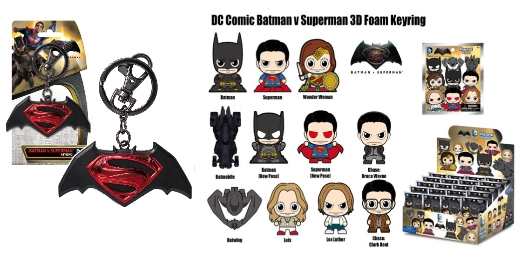 • From DC Comic’s upcoming movie Batman V Superman, Monogram will be offering the new Batman vs Superman Logo Pewter Key Rings in 2 styles, along with a new series of DC Collectible 3D Foam Key Rings featuring popular characters such as Batman, Superman and many more great characters.