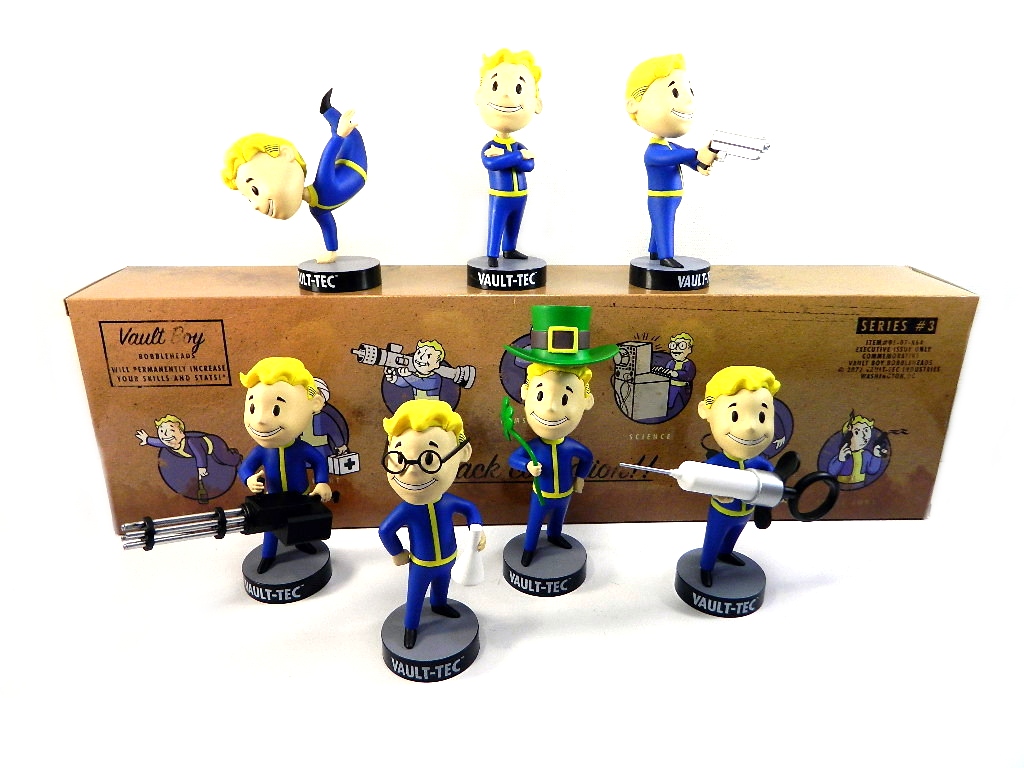 Gaming Heads has released their third and final set of Fallout 3 Vault-Tec Vault Boy Bobbleheads. It took a lot longer to collect all these bobblehead perks than in the game (1 wave per year = 3 years), but ultimately having a complete collection has been worth it.