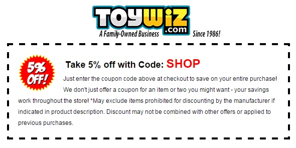 ToyWiz.com has thousands of in-stock items. Use the coupon code SHOP and receive 5% off your purchase! Shop from an incredible selection of the newest and most popular action figures, toys, and collectibles including: