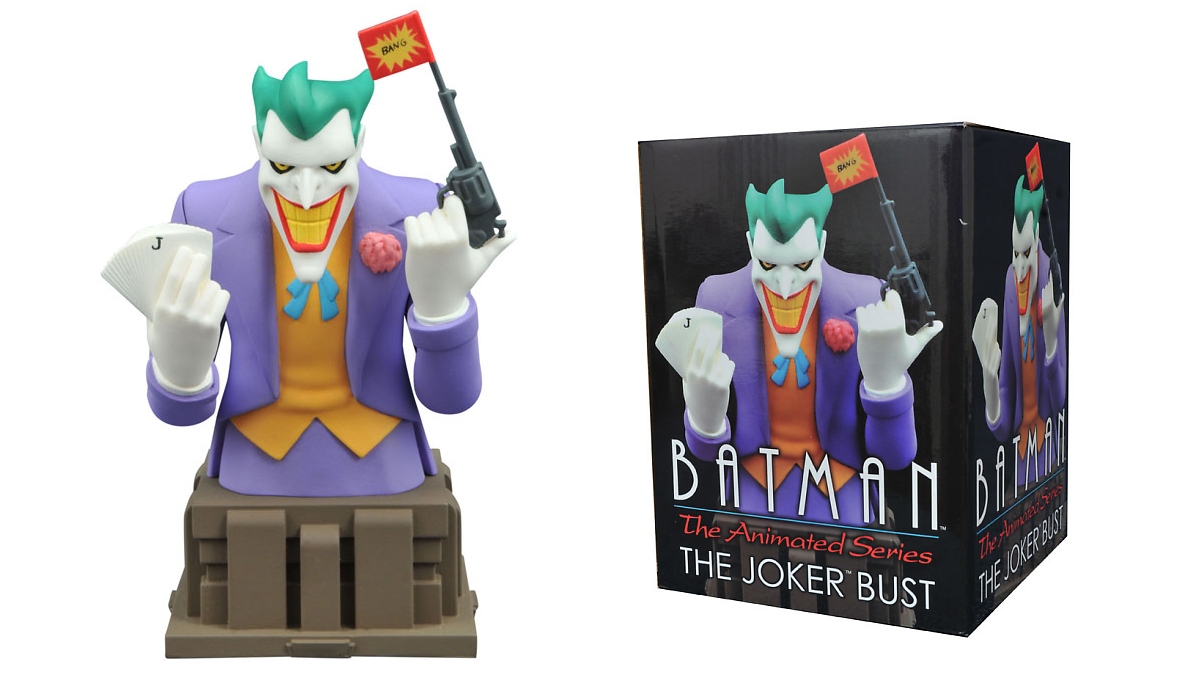 The Clown Prince of Crime joins DST’s line of resin busts based on Batman: The Animated Series! With a fan of cards in one hand and a toy pistol in the other, this bust of The Joker is not just playing around, and is a spot-on representation of the character as he appears in the classic animated series. Measuring approximately 6 inches tall, this resin bust is packaged in a full-color window box, with a certificate of authenticity. Limited to 3,000 pieces! Sculpted by Varner Studios. (Item #NOV152178, SRP: $59.99)