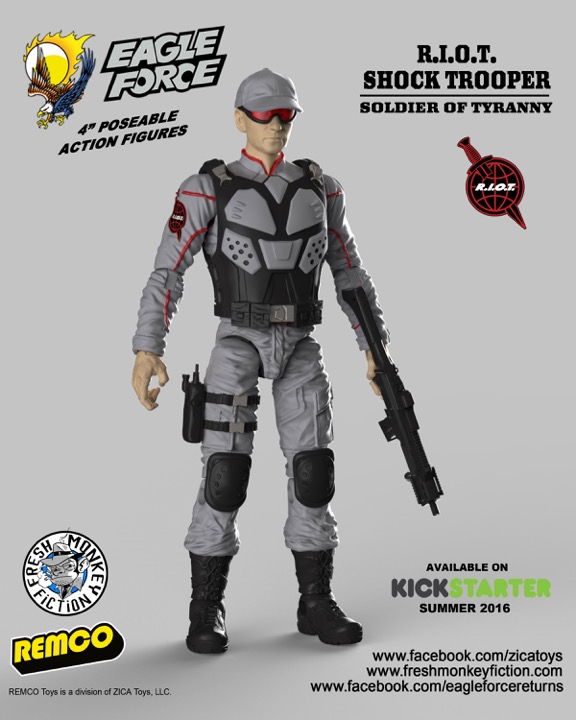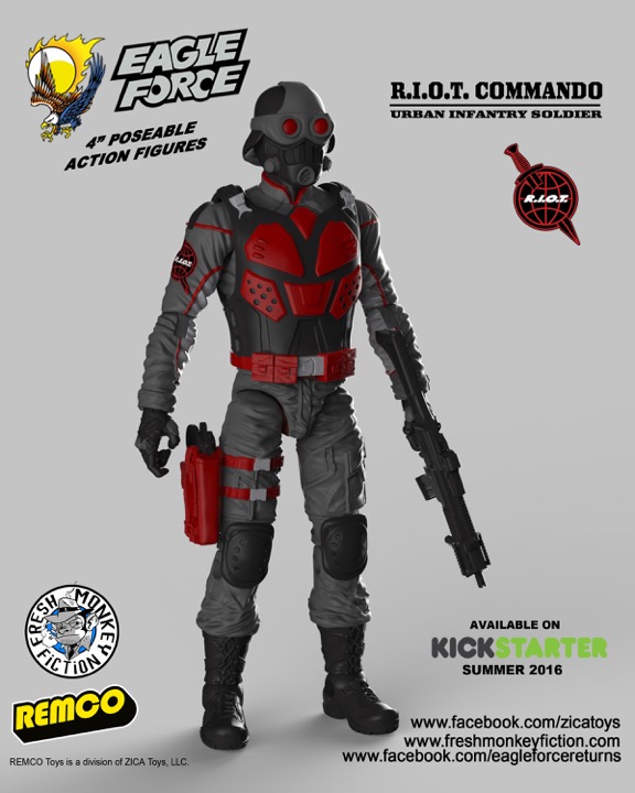 Not many folks do, but don't worry, Fresh Monkey Fiction and Remco are teaming up to give this crack military team another fighting chance with the EAGLE FORCE RETURNS toy line later this summer. These modern 4" scale military action figures will bring back the sense of realism, action and fun that has been missing from toy shelves for the last few years. The toy line will see the return of Captain Eagle to the front lines as he reforms Eagle Force to confront the evil forces of R.I.O.T. (Roving International Organization of Tyranny) who’s quest for world domination threatens the globe.