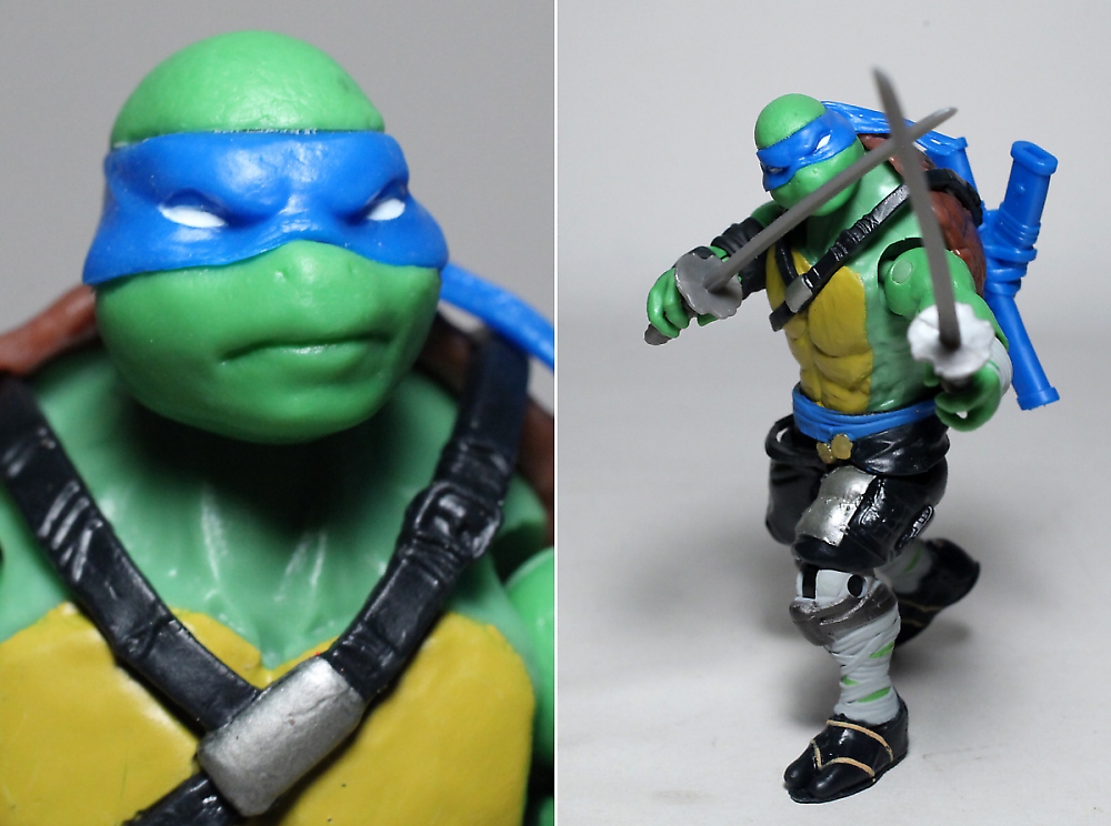 Leonardo, the leader in blue, is the most fit of the foursome, with a serious but calm expression. His armor, or lack thereof gives him the most ninja-like design whereas his brothers have a little bit more attitude in varying degrees.