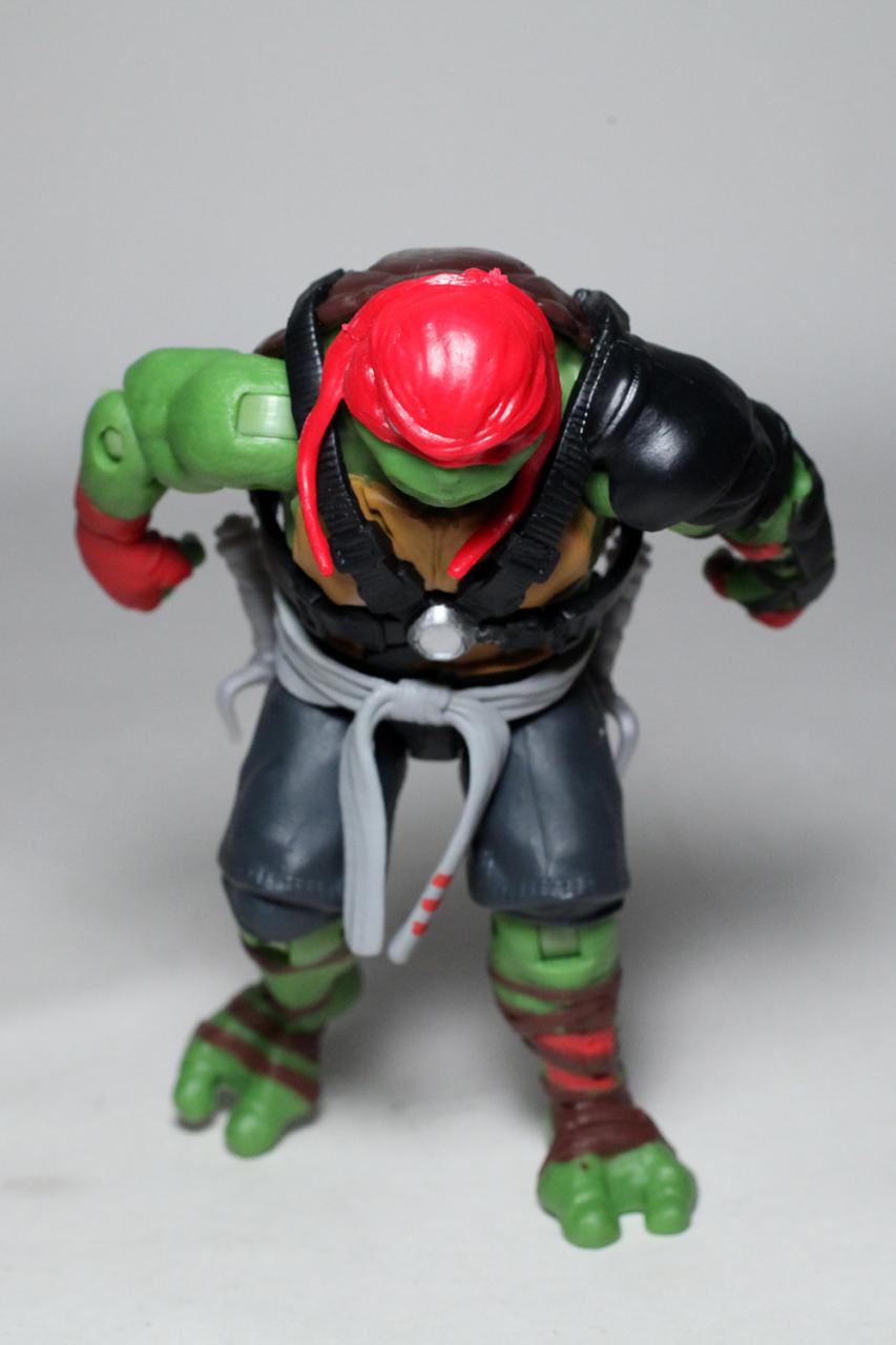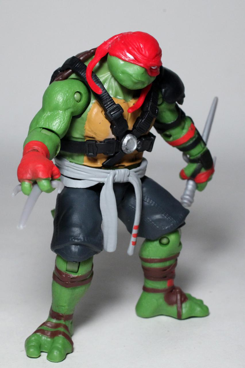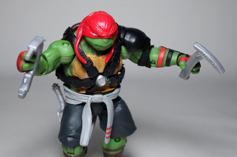 Raphael in red, is a bulkier turtle, with his mask covering his entire head rather than just around the eyes. Raph is the meanest of the bunch, expression wise. Ralph is bare footing it while his brothers are going with more protection.