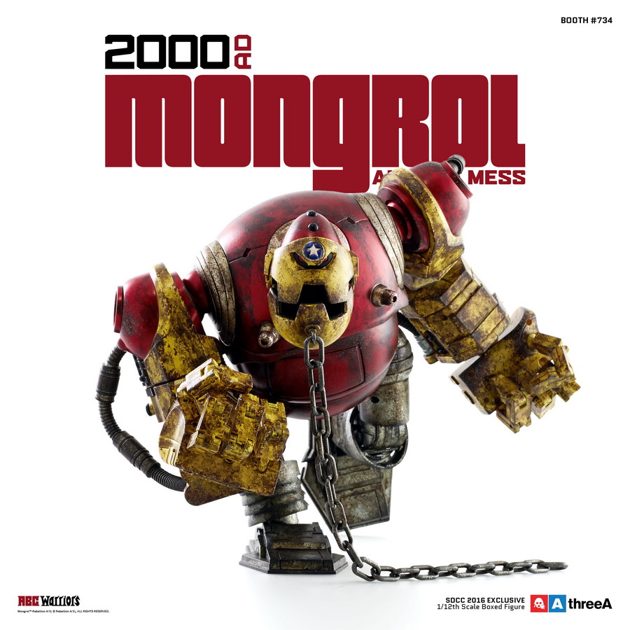 2000 AD and 3A are excited to announce the SDCC 2016 LTD EDITION EXCLUSIVE MONGROL AND THE MESS! The A.B.C. Warrior features a new metallic red paint scheme, heavy weathering, and detailing inspired by the painted pages of Kev Walker – all in glorious 1/12th Scale!