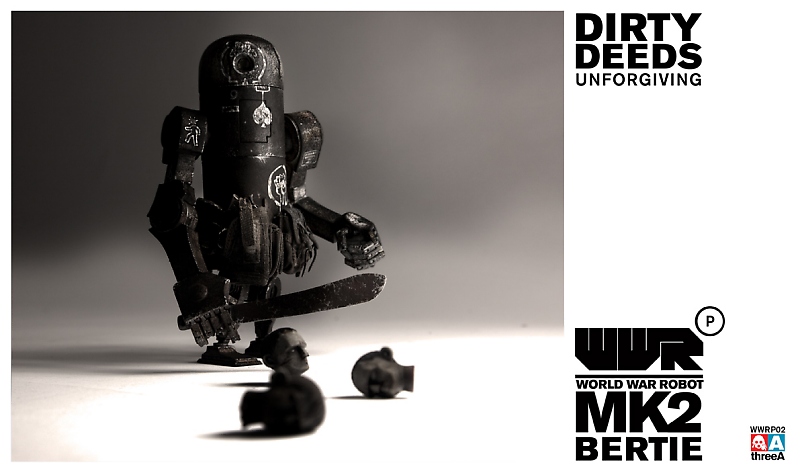 * Set of Twelve (12) Dirty Deeds Berties (set not pictured). Each Dirty Deeds Bertie will feature unique decals and a more varied selection of weapons. Two WWRp Squares will be included. This set will come signed by signed by Ashley Wood and Kim Fung Wong, owner of 3A Toys.
