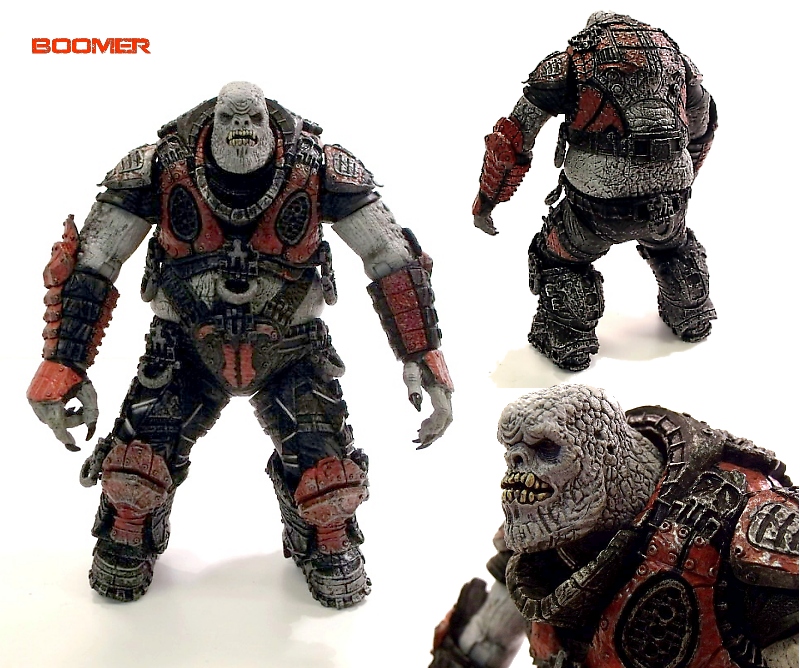 Standing around 7 1/2" tall, the Boomer stands only slightly taller than the rest of the Gears line, but more than makes up for it in mass. It's not 100% game accurate in height, but the Boomer's incredible sculpt - wicked armor and gun - greatly overshadows this one discrepancy in my book. While not necessary, NECA even addressed the Boomer's size in detail HERE, explaining how extra weapon's tooling needed to be factored in for future Boomer releases. And oh, what Boomers we have coming! Confirmed Boomers include the Boomshield and flail-swinging Mauler, Mulcher-toting Grinder and cleaver-chopping Butcher. A measly inch is a small sacrifice for the wonderful Boomer figures in store for us.