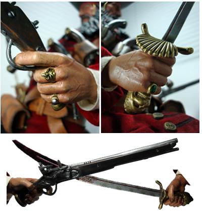 PAINT: The paint apps on Blackbeard do nothing buy accentuate the detail in the sculpt. Everything has been painted beautifully, especially the features of the face. His grizzled face is dirty and tan, his teeth are yellow and rotten looking (as are his fingernails), and his eyes and lip are wet. His hat, shoes, and belts have a brushed treatment that really gives the appearance of worn leather. The base has also been given a fantastic treatment with a finish to the cannon that makes it look like real metal and several color coats that give the deck a real wood-grain texture and appearance.