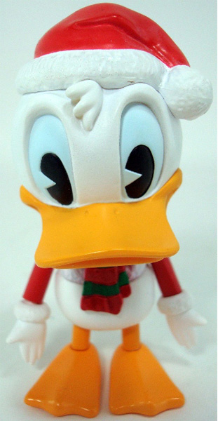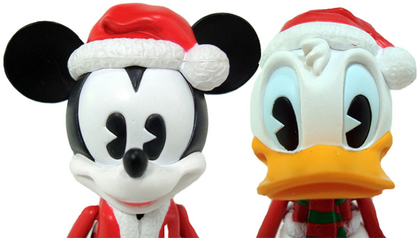 The Cosbaby figures come packages in a small window box with Mickey and Donald peeking through. The die-cut of the window coincides with the wreath design on the front and top of the box, highlighted by a large bow with the Mickey icon. The color scheme of the package is, of course, red and green, featuring a plaid wallpaper pattern and ribbon with the Mickey icon repeating around the entire box. The character’s names are printed on either side of the box underneath a sprig of holly as well. The toys themselves come in a plastic shell to keep them protected.