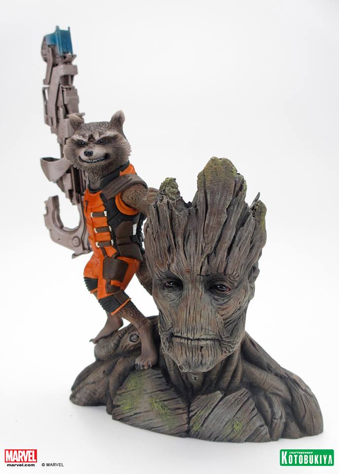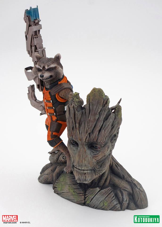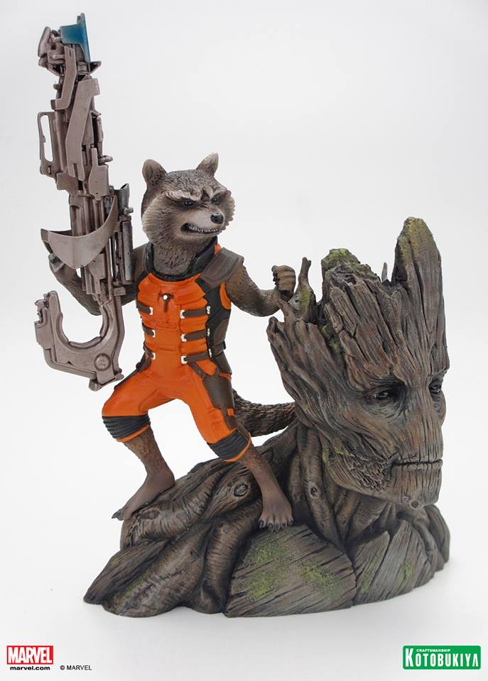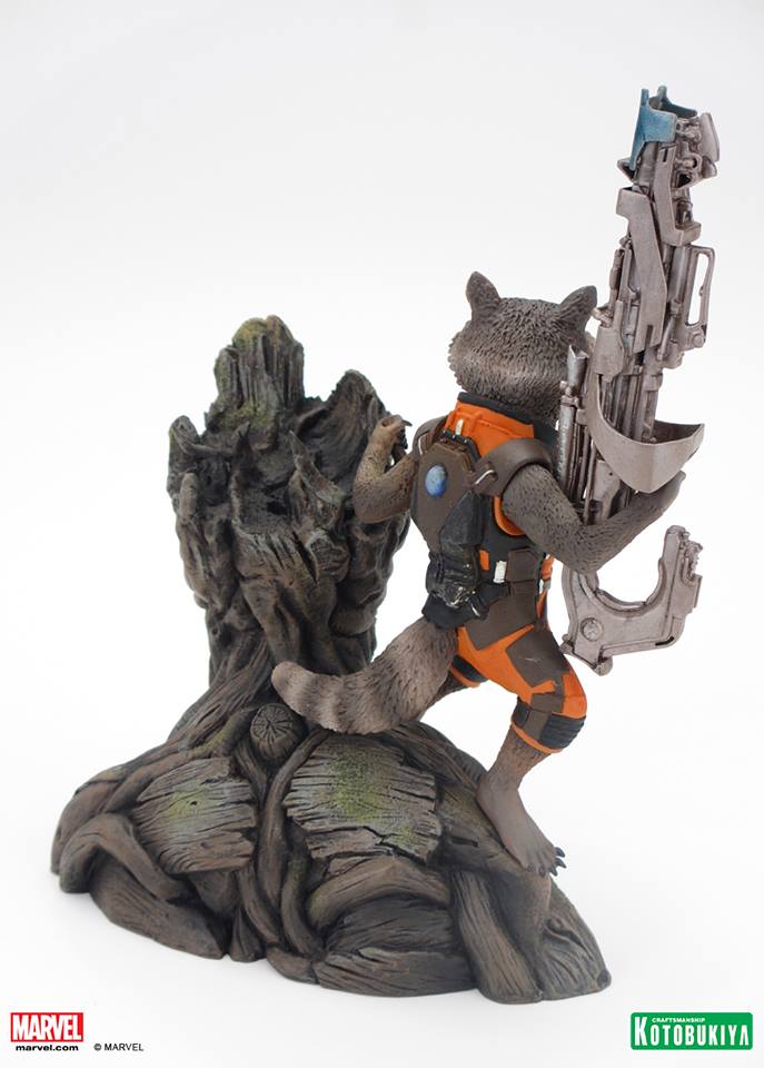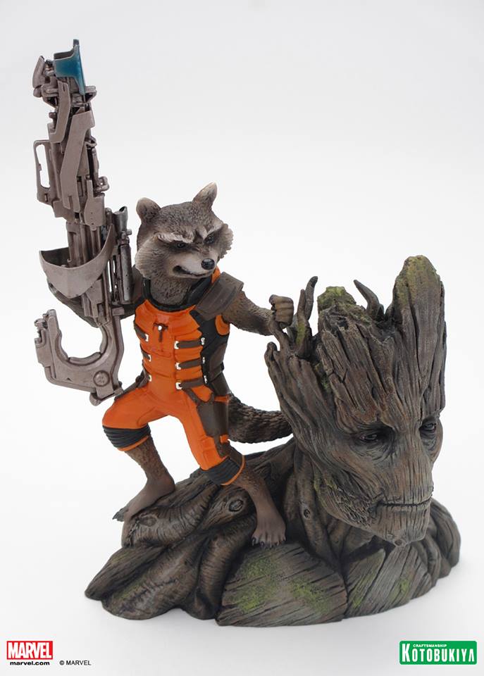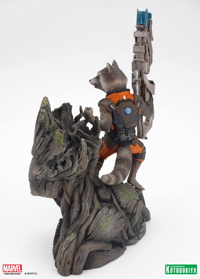 We saw this cool piece behind closed doors at Toy Fair, but because the trailer hadn't launched yet, Koto had to keep it top secret. Not anymore! Presenting Kotobukiya's GUARDIANS OF THE GALAXY Rocket Raccoon (and Groot) ARTFX+ Statue