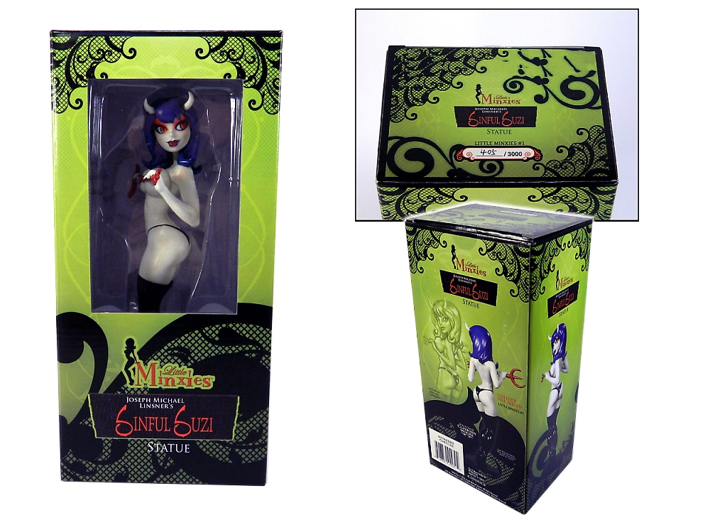 Clayburn Moore is best known in the industry for his hyper-realistic sculpting of hyper-gorgeous women. Occasionally he lets his hair down, so to speak, and tries his hand at more light-hearted subjects, such as Dean Yeagle's Mandy and Frank Cho's Liberty Meadows. More recently Mr. Moore has been having some vinyl figure fun, his Mondo-chi being an artistic take on his pet Chihuahua, and the subject of this review, Little Minxies, a collaboration with Manuel Carrasco involving sexy pinup interpretations of fan favorite characters and original creations. While I look forward to seeing what original creations Moore and company have in mind for the series, Little Minxies is off to a strong start with some cute comic character choices. Already announced is David Mack's Kabuki and Top Cow Productions' Aphrodite IX. Joseph Michael Linsner's Sinful Suzi launches Little Minxies with some seductive sex appeal, the mischievous demon-girl available now priced at $44.95 and limited to 3000 pieces.