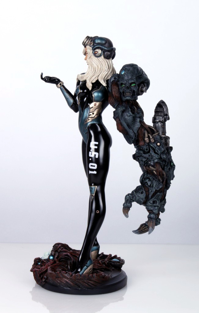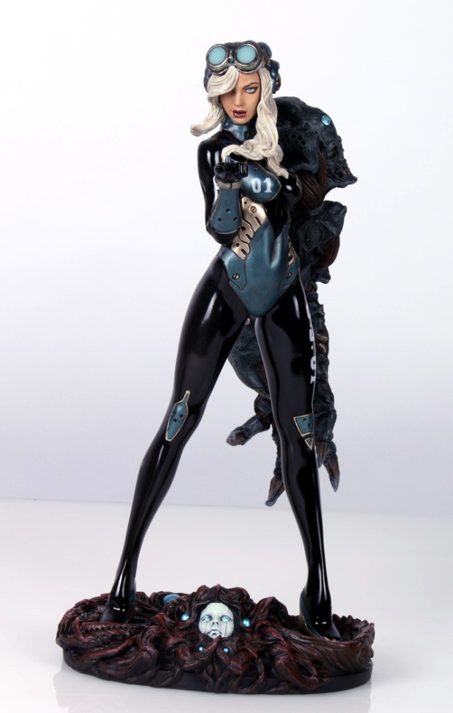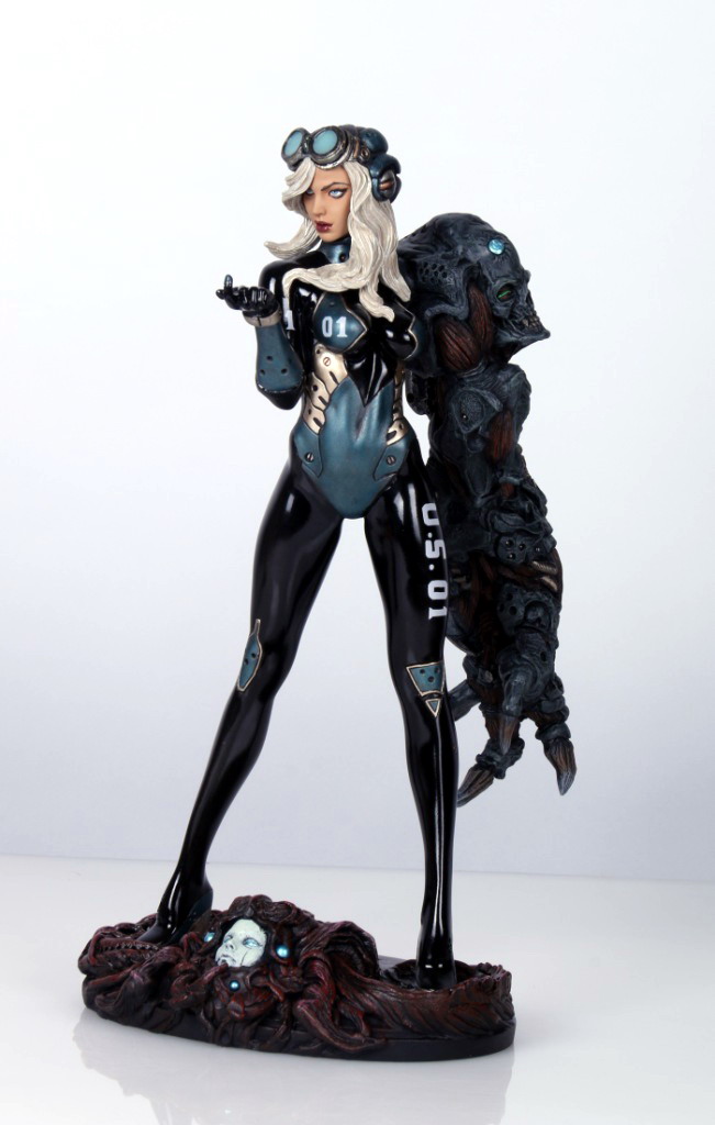 Yamato USA announces that they have reworked the paint applications on their upcoming Fantasy Figure Gallery Sculptor's Original: SPACE HOST GIRL by Erick Sosa. Cast in resin, this 1:6th scale (approx. 14" with base) statue combines an exotic sci-fi mix of woman, monster and technology. You can see the improvements in the photos above, the new Space Host Girl featuring a nice glossy black and metallic blue outfit, along with the addition of stamped white insignia (U.S. 01) on her left leg and breast.